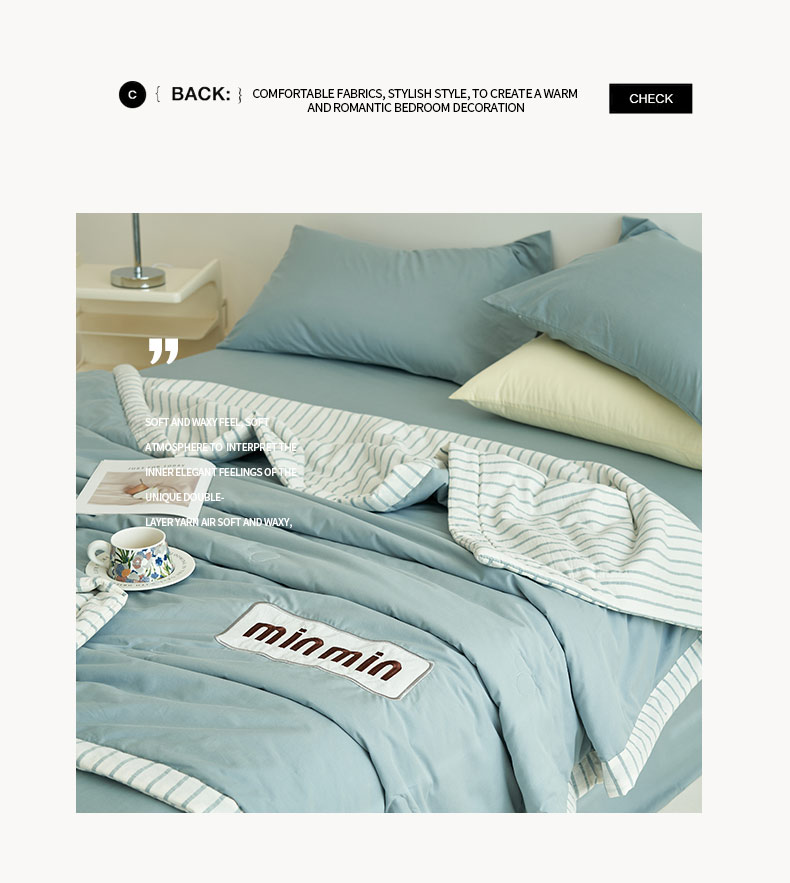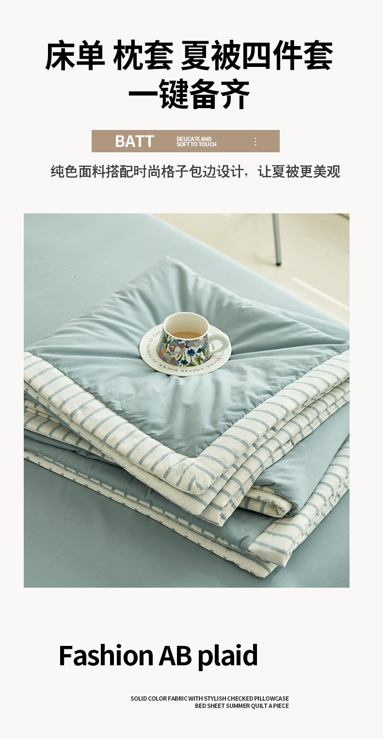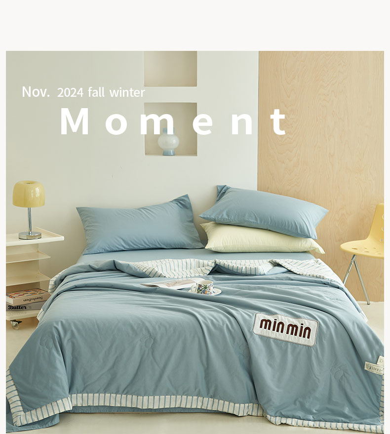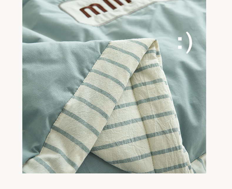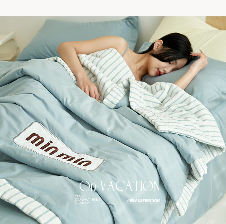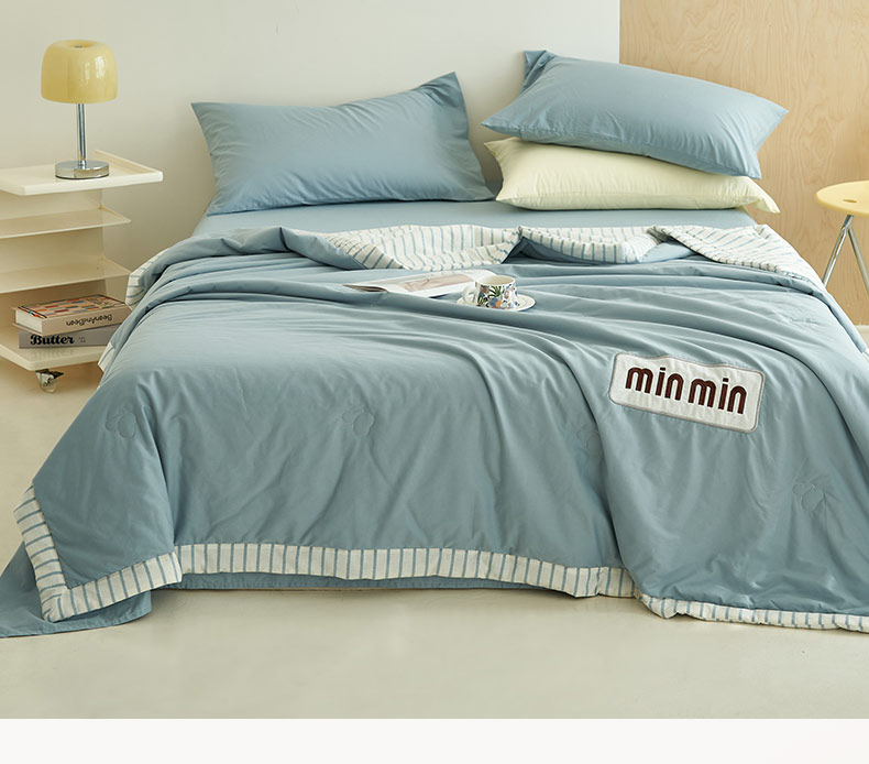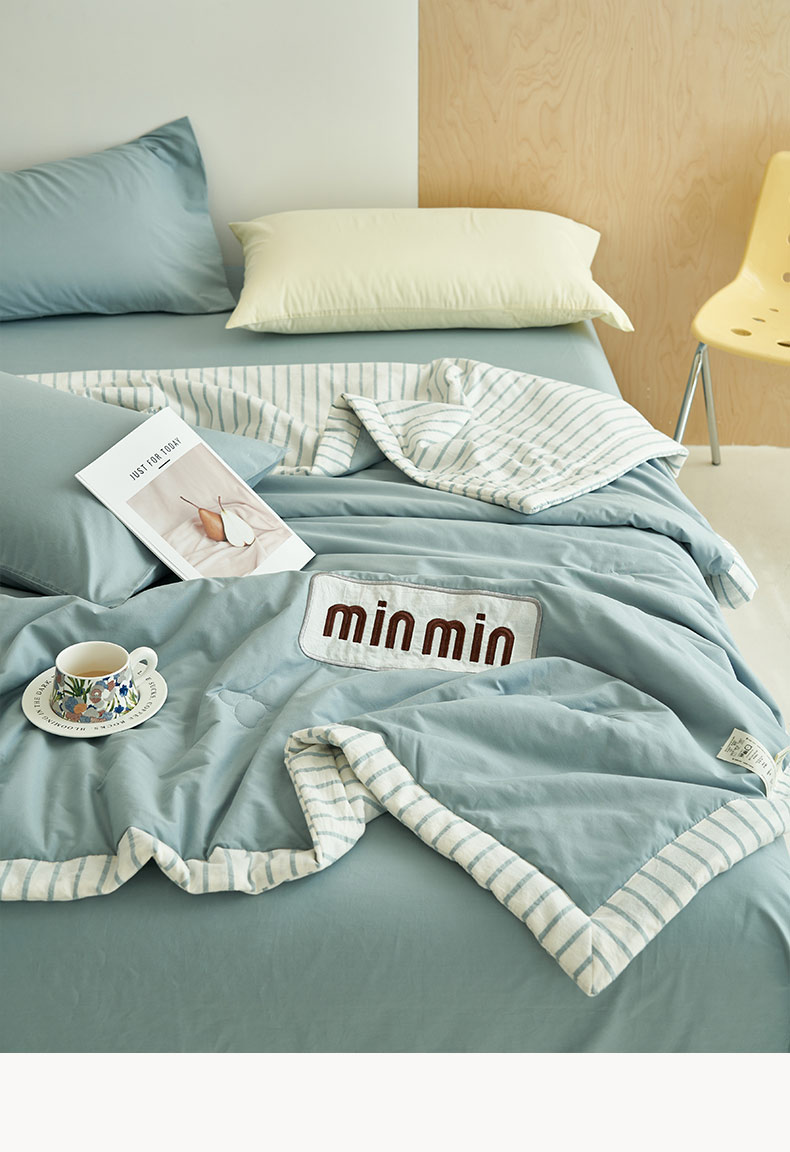 • 91家纺网 家纺一手货源 找家纺 寐绸家纺 2025新款纯棉水洗棉min绣花竖条边大豆纤维夏被四件套 MIN-浅蓝