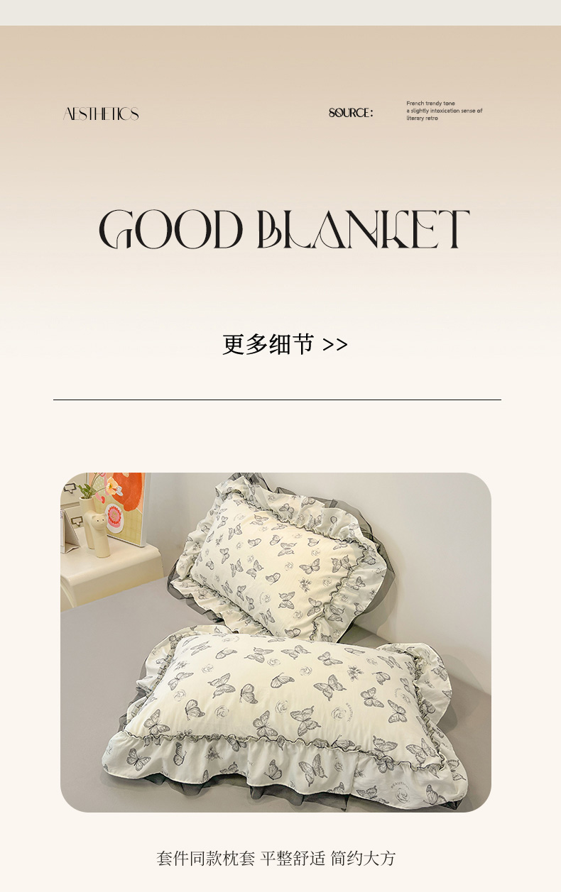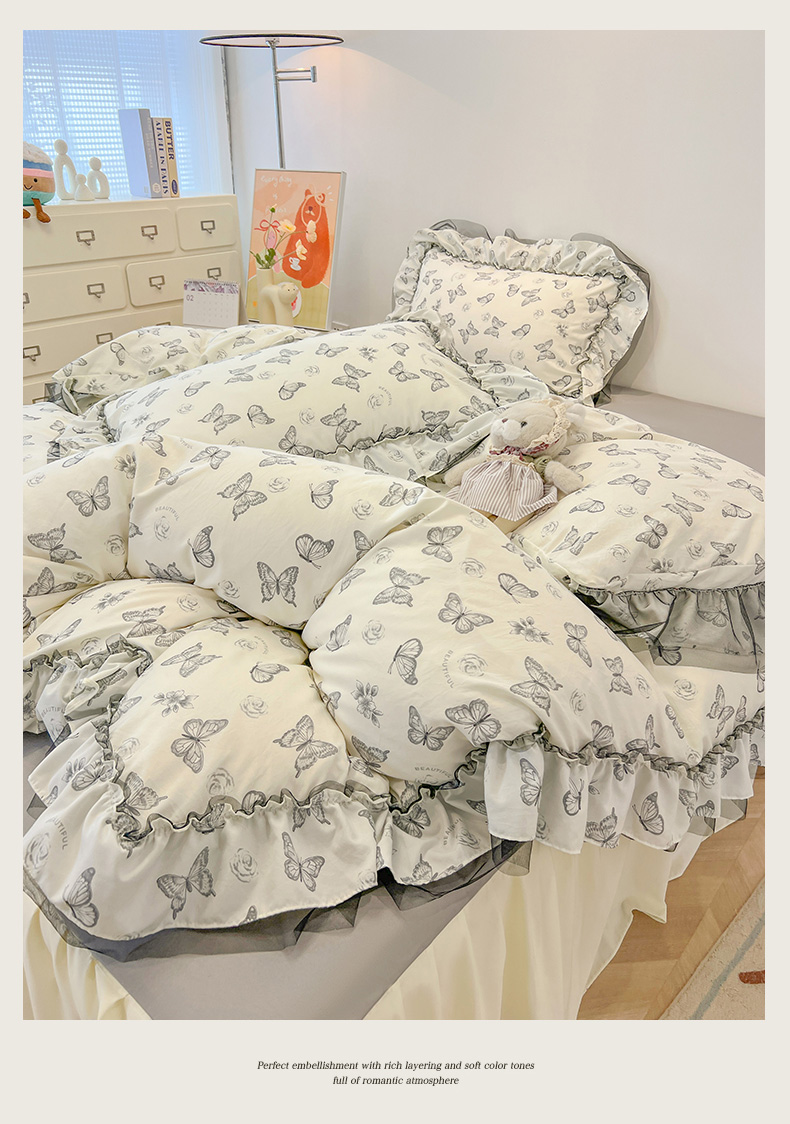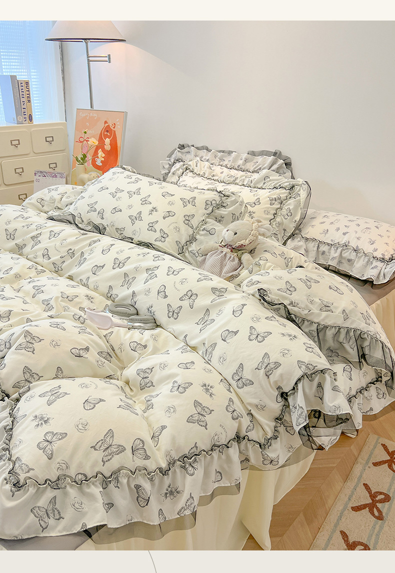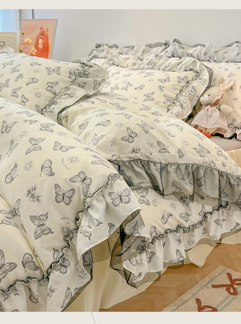 当前位置: 91家纺网 > 商品网购 > 床品套件 > 四件套 > 其它四件套 > 眠帛家居 2025新款A类皱皱纱蕾丝花边四件套 蝶舞