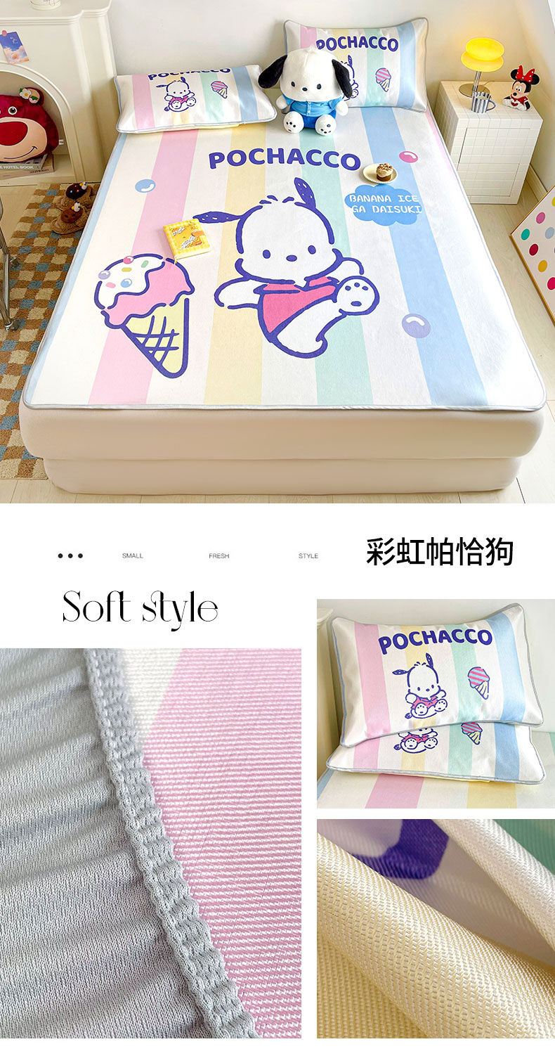 商品名称:米帛家纺 2025新款 A类大版三丽鸥冰藤席-床笠款 彩虹帕恰狗