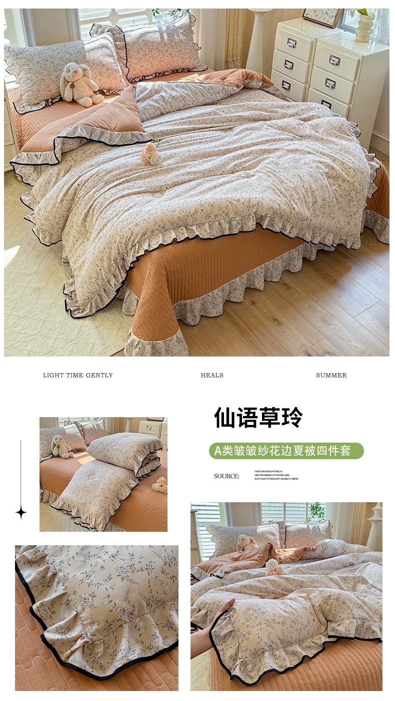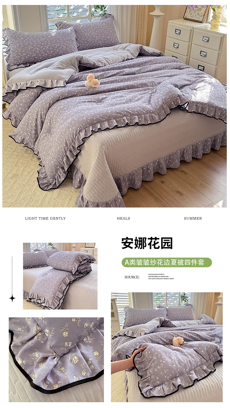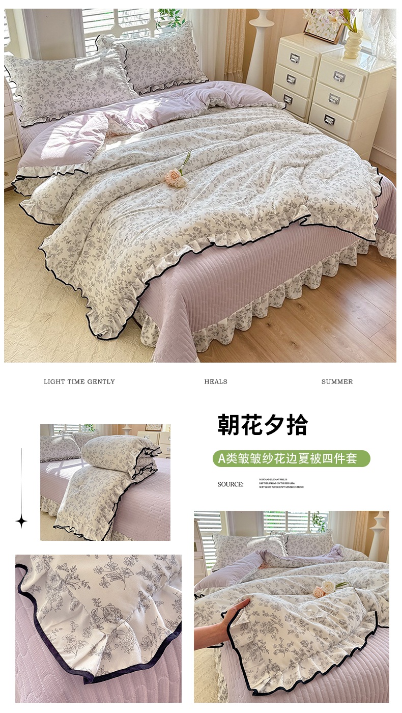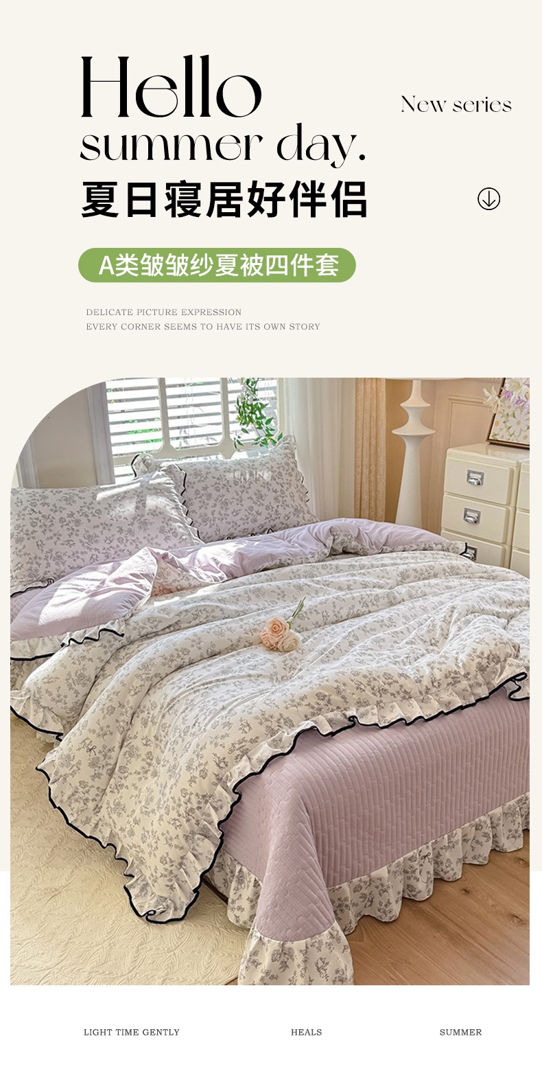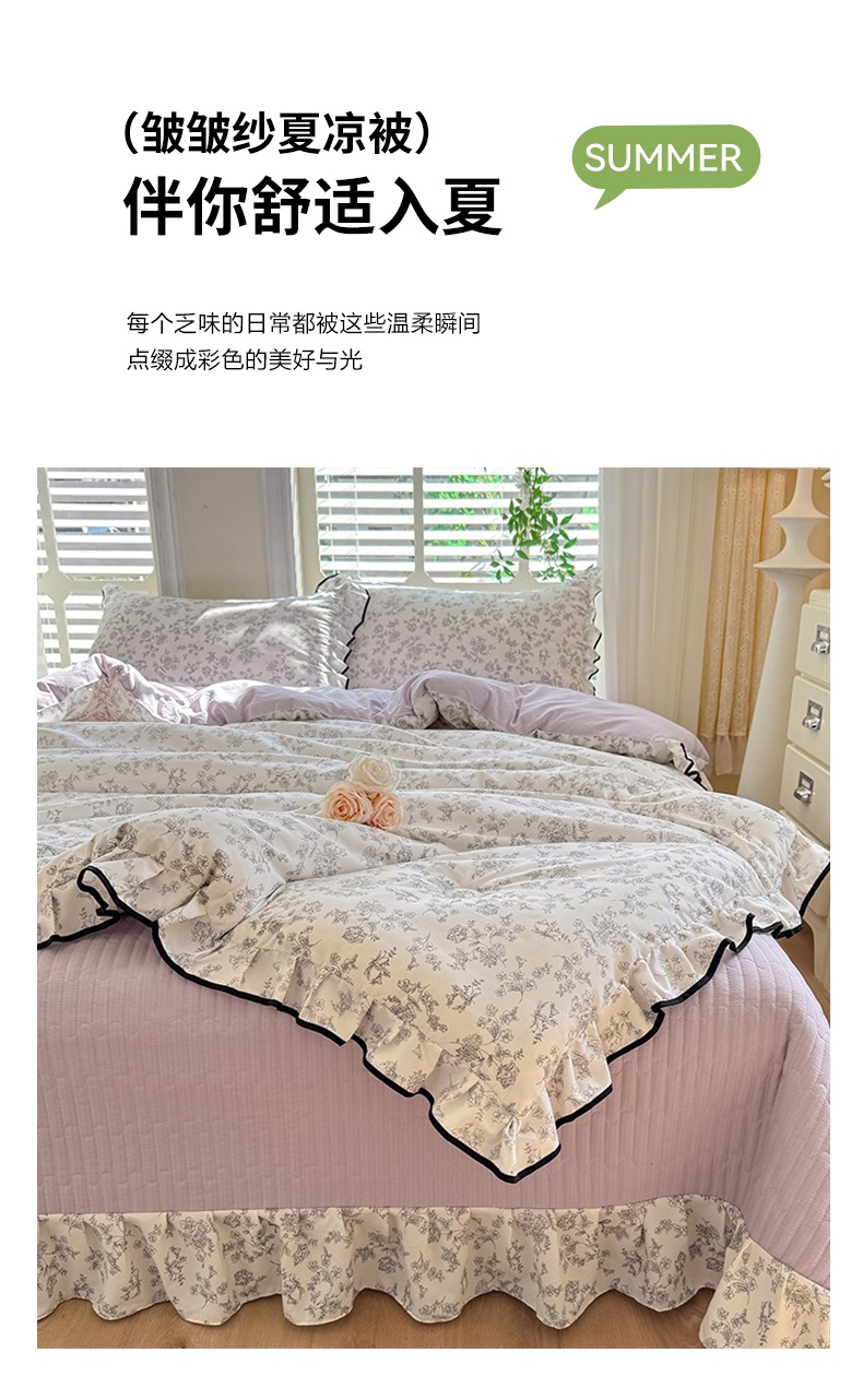 当前位置: 91家纺网 > 商品网购 > 床品套件 > 四件套 > 夏被四件套 > 韩约家纺 2025新款1皱皱纱花边夏被四件套 朝花夕拾