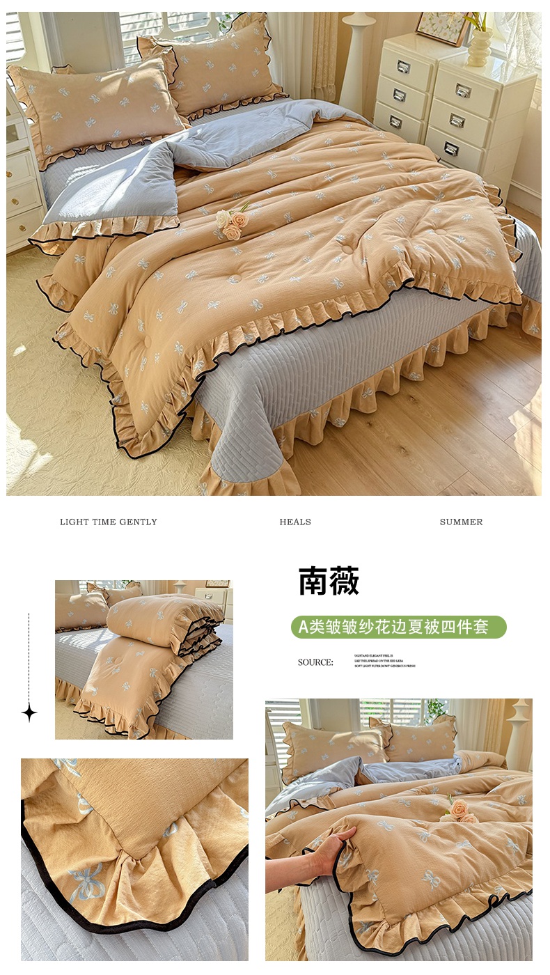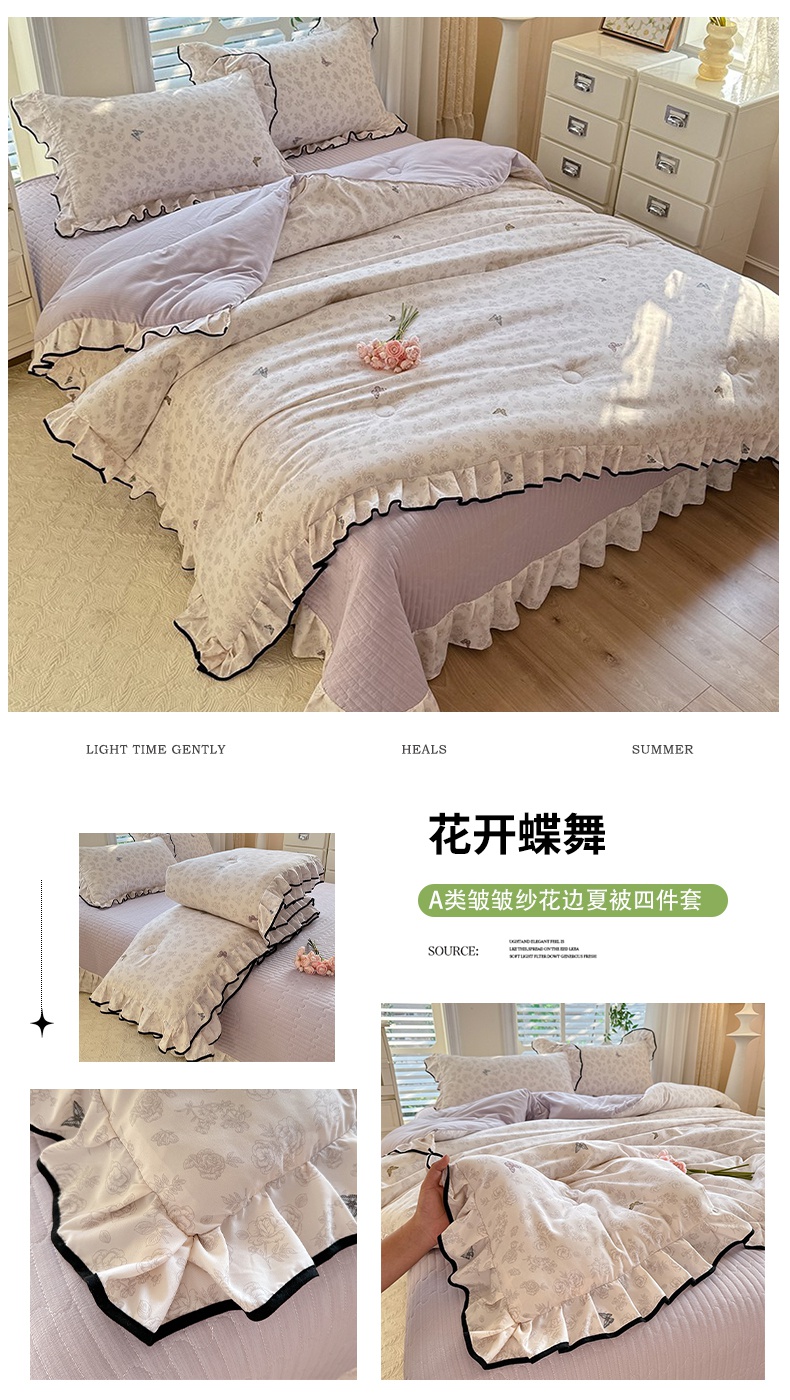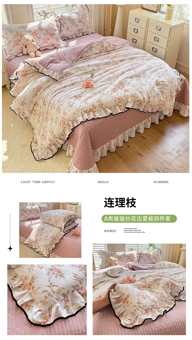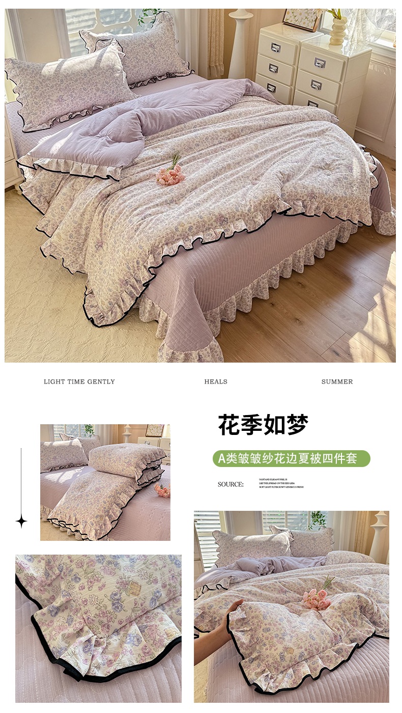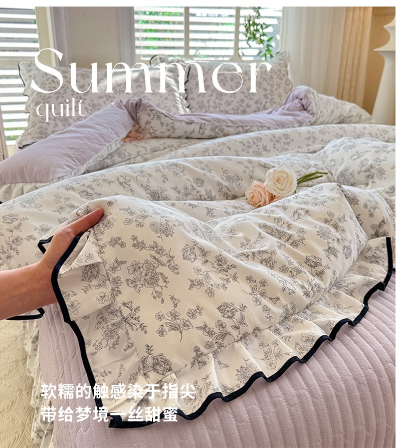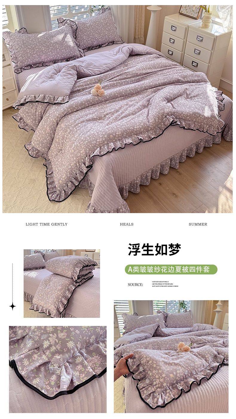 当前位置: 91家纺网 > 商品网购 > 床品套件 > 四件套 > 夏被四件套 > 韩约家纺 2025新款1皱皱纱花边夏被四件套 朝花夕拾