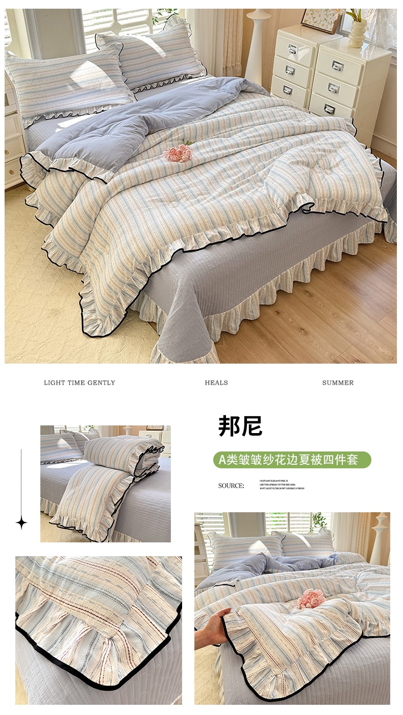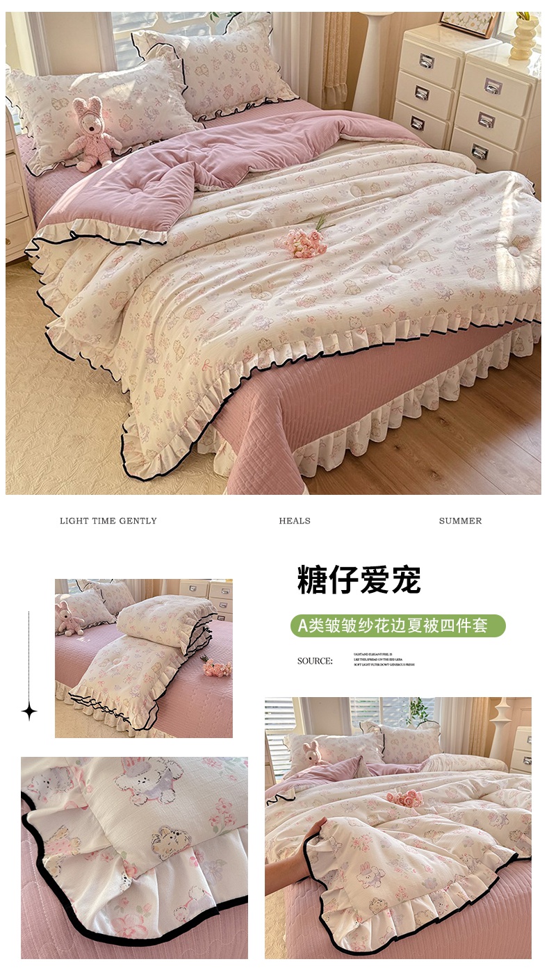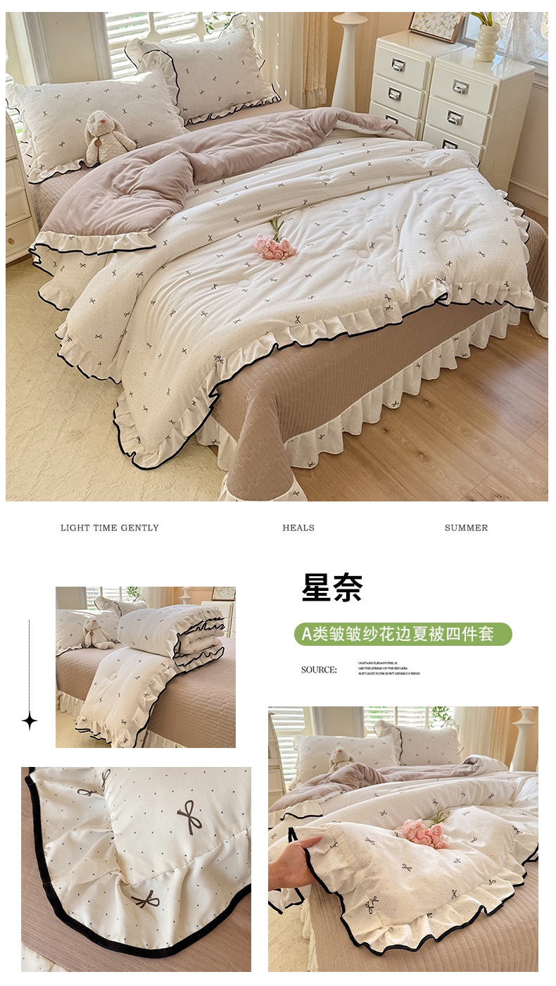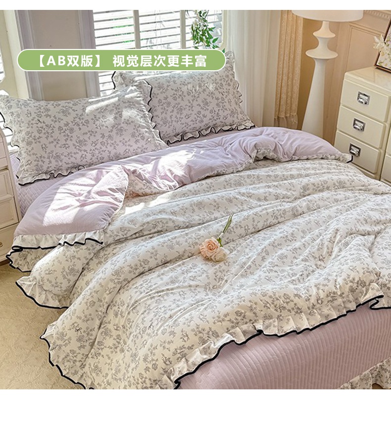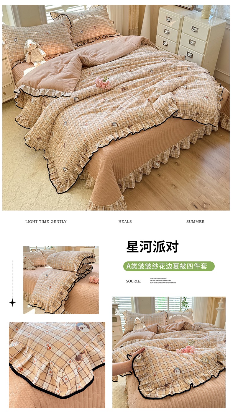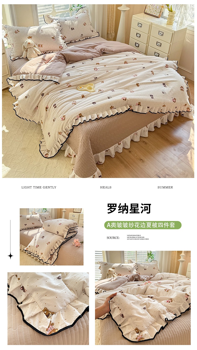 当前位置: 91家纺网 > 商品网购 > 床品套件 > 四件套 > 夏被四件套 > 韩约家纺 2025新款1皱皱纱花边夏被四件套 朝花夕拾