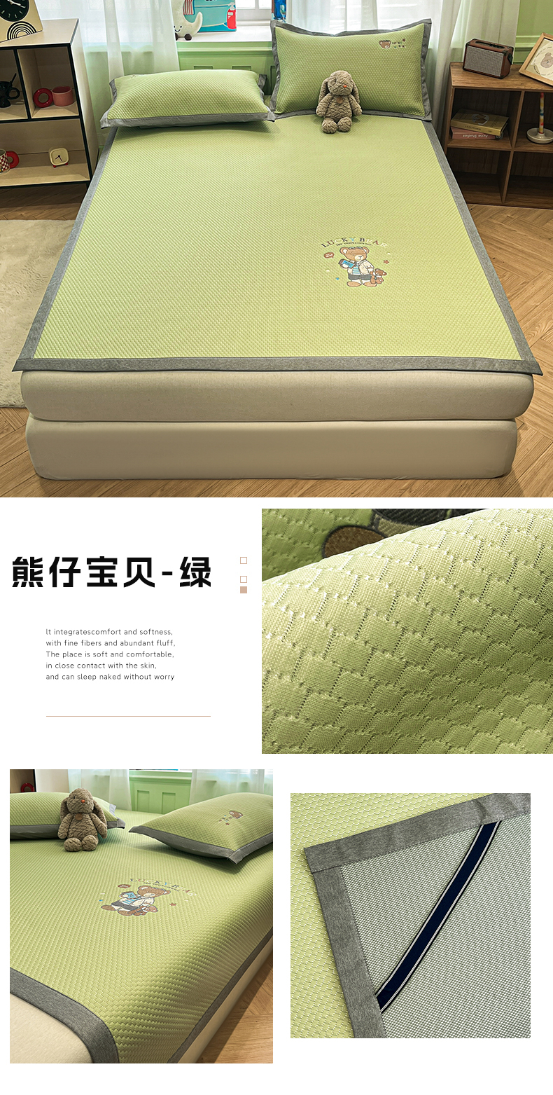 商品名称:启程家纺 2025春夏新款冰豆豆凉席刺绣款复合三明治三件套 熊仔宝贝-绿