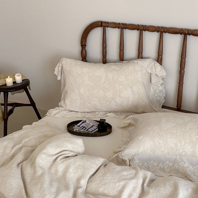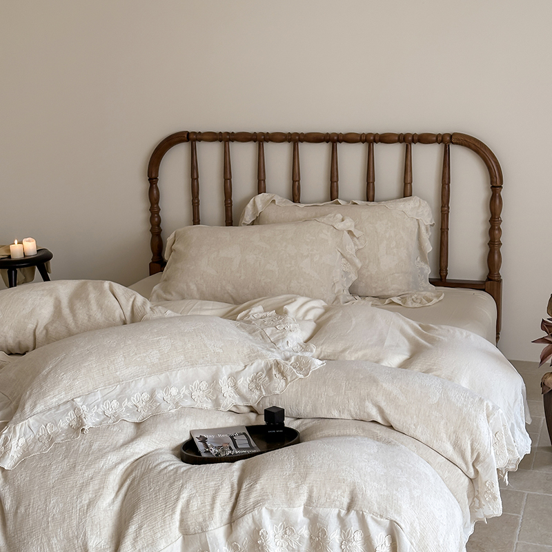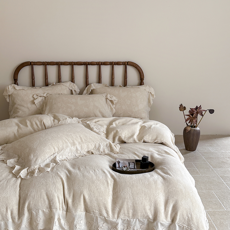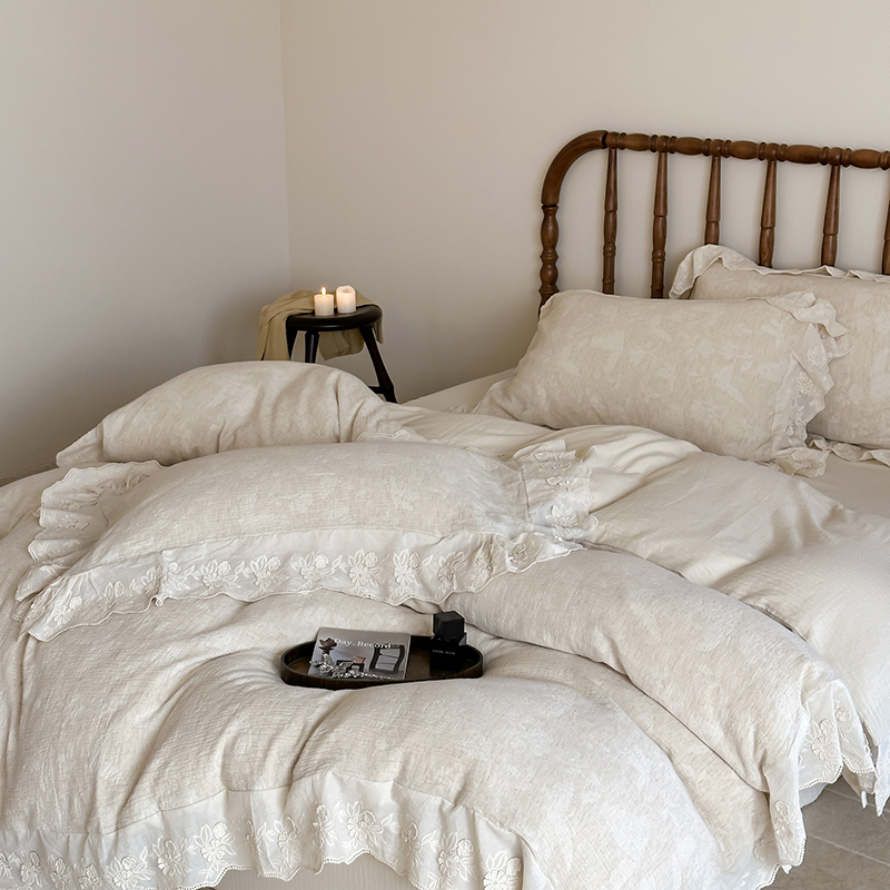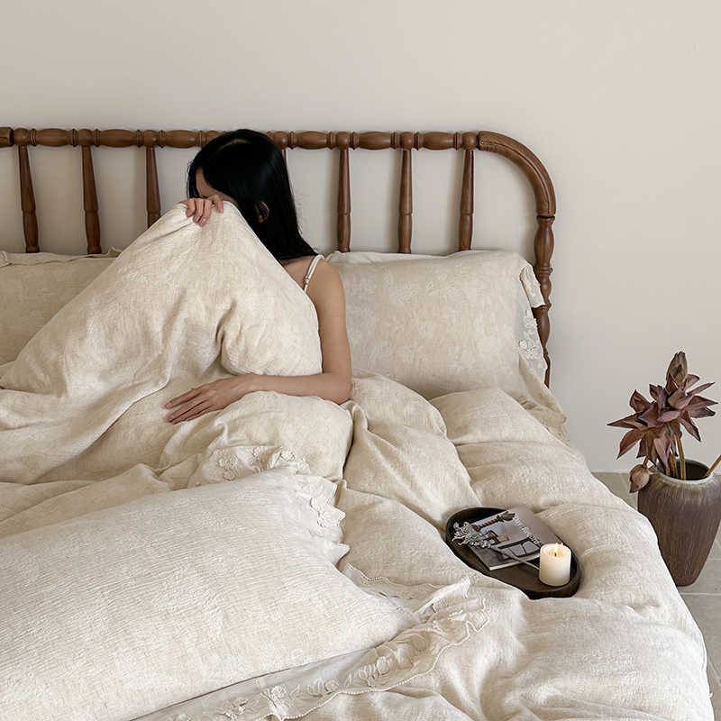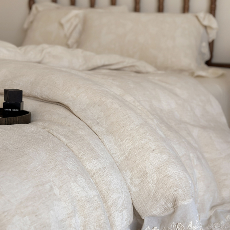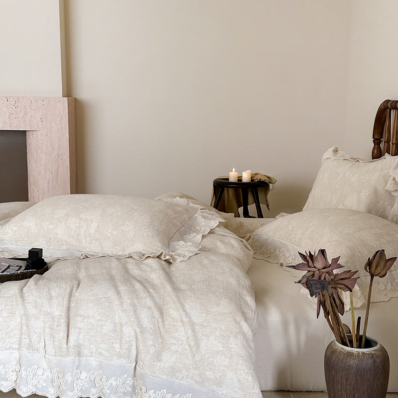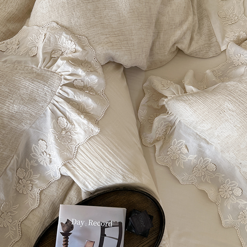 山舍家居2025新款纯棉棉麻色织提花刺绣花边款四件套-蝶梦晚落 蝶梦晚落-麻本色