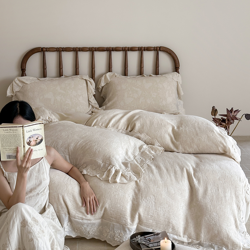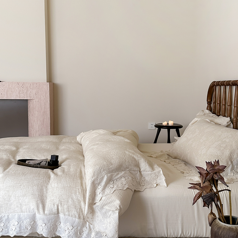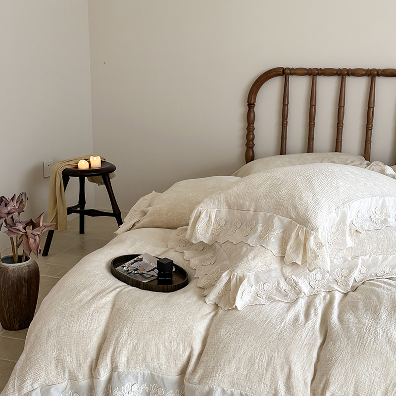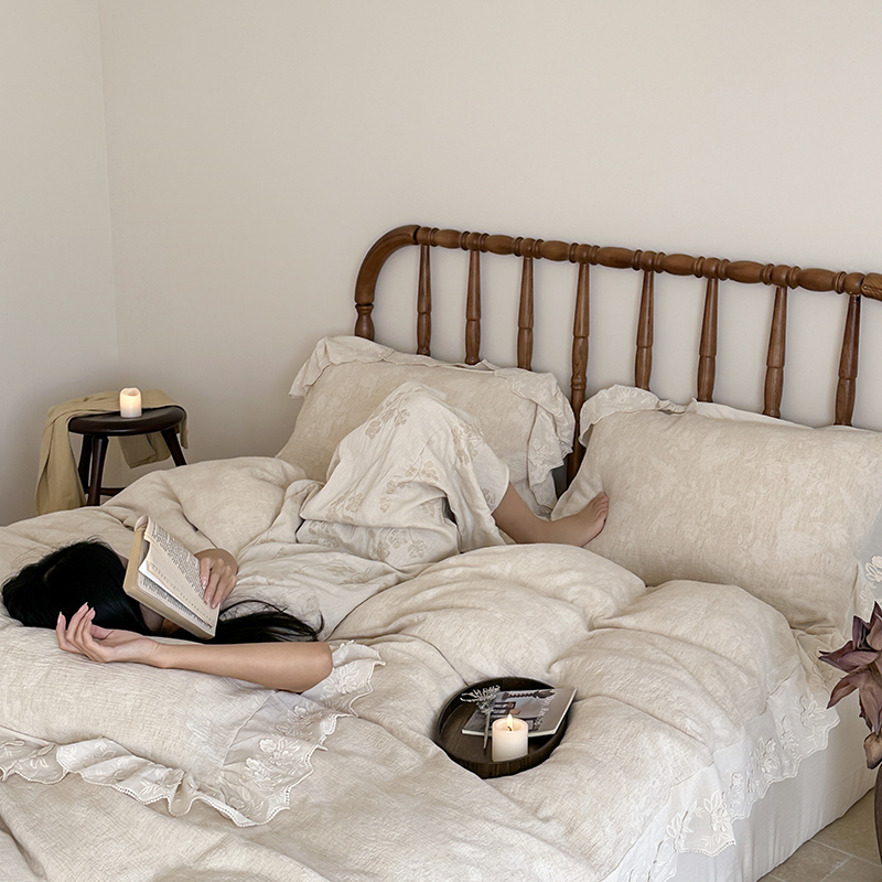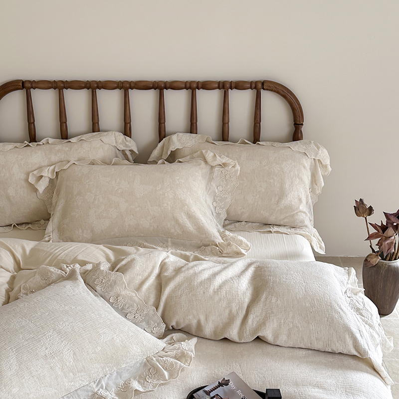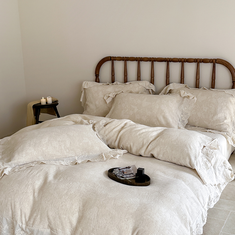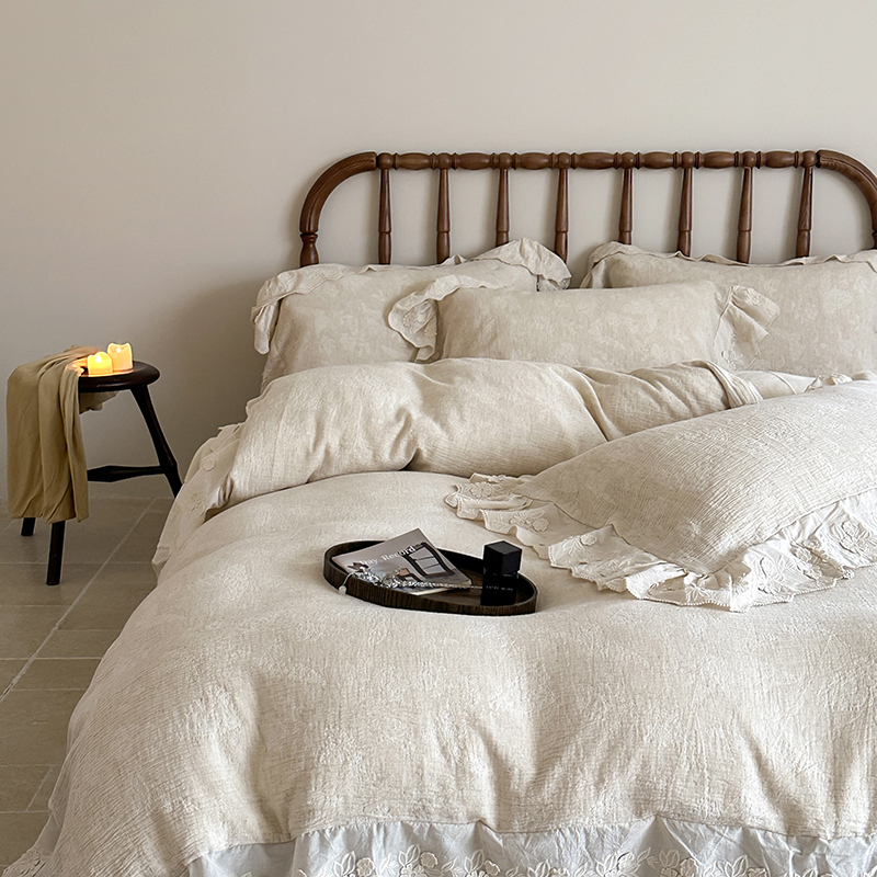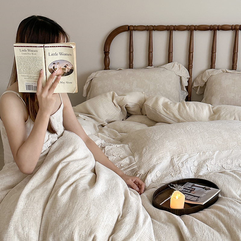 山舍家居2025新款纯棉棉麻色织提花刺绣花边款四件套-蝶梦晚落 蝶梦晚落-麻本色