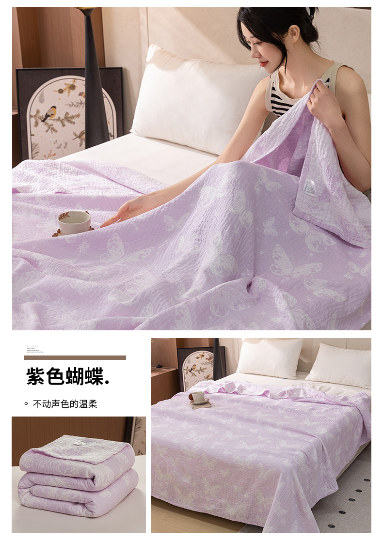 商品名称:乐家毛巾被 2025春夏新款三层棉全棉纯棉毛巾被 紫色蝴蝶