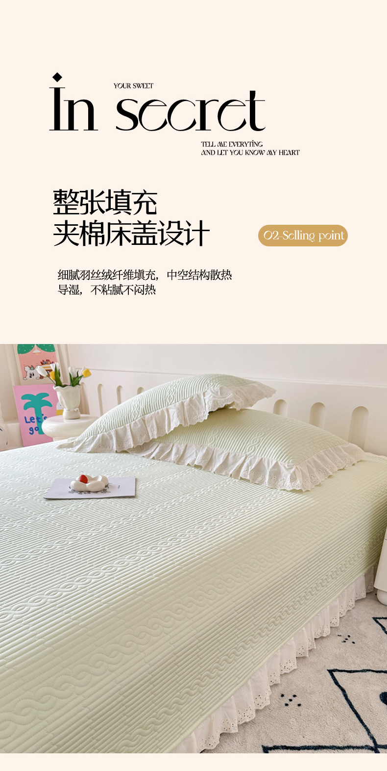 • 91家纺网 家纺一手货源 找家纺 岚吉 2025新款莫代尔纯色小花边床盖三件套 奶油绿