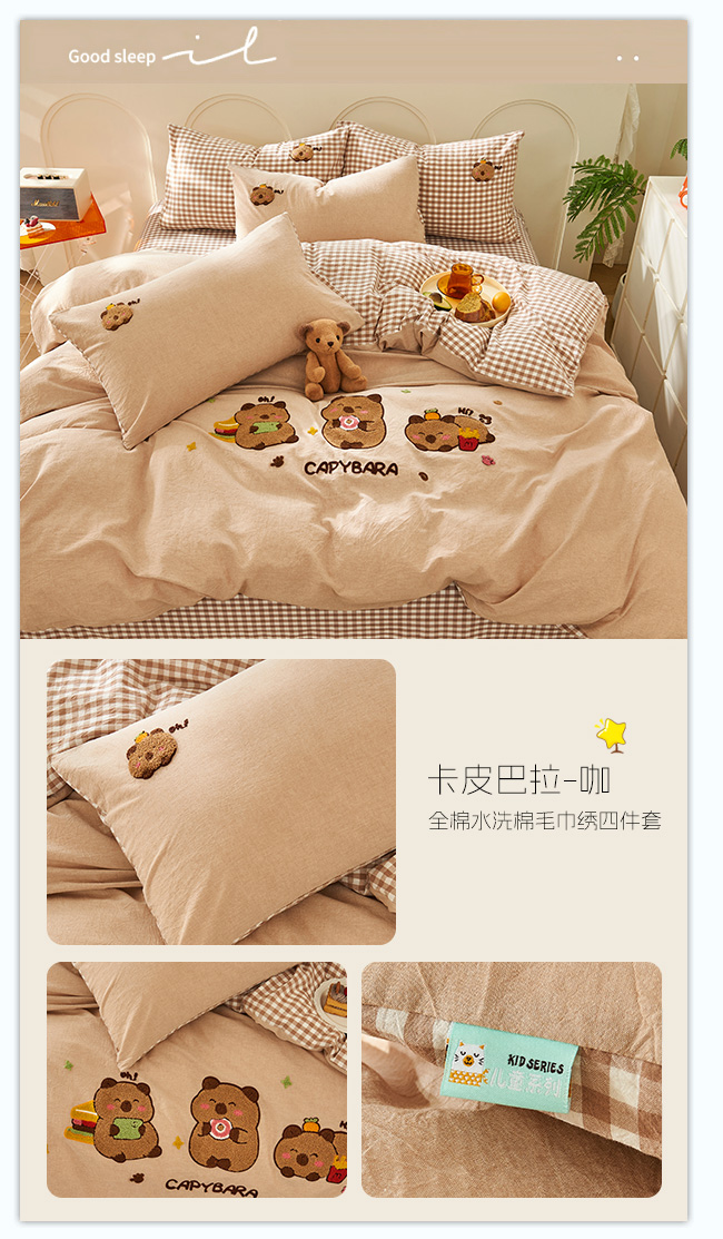 当前位置: 91家纺网 > 商品网购 > 床品套件 > 四件套 > 毛巾绣四件套 > 徕米家居 2025新款色织全棉水洗棉毛巾绣四件套 卡皮巴拉-咖