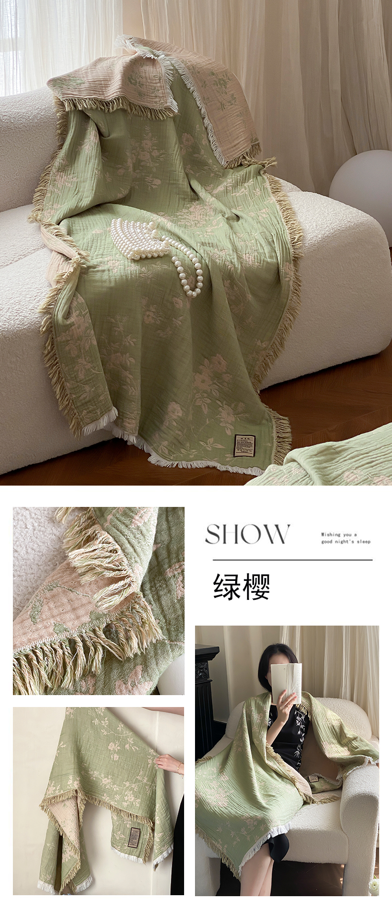 商品名称:麻依 2025新款全棉流苏纱布披肩浴巾旅行毯 绿樱