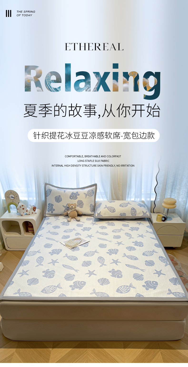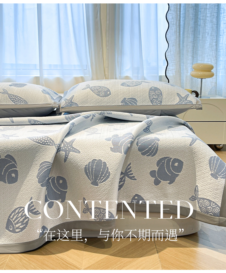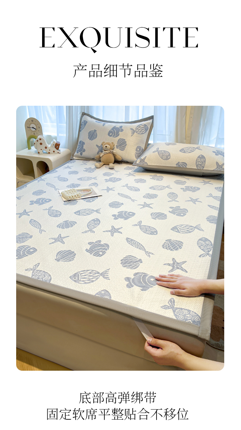 商品名称:LIFE.丽芙 2025春夏季新品A类针织提花冰凉豆豆凉感软席子平铺绑带款冰丝凉席三件套(450克)-风格二 海底世界-海蓝