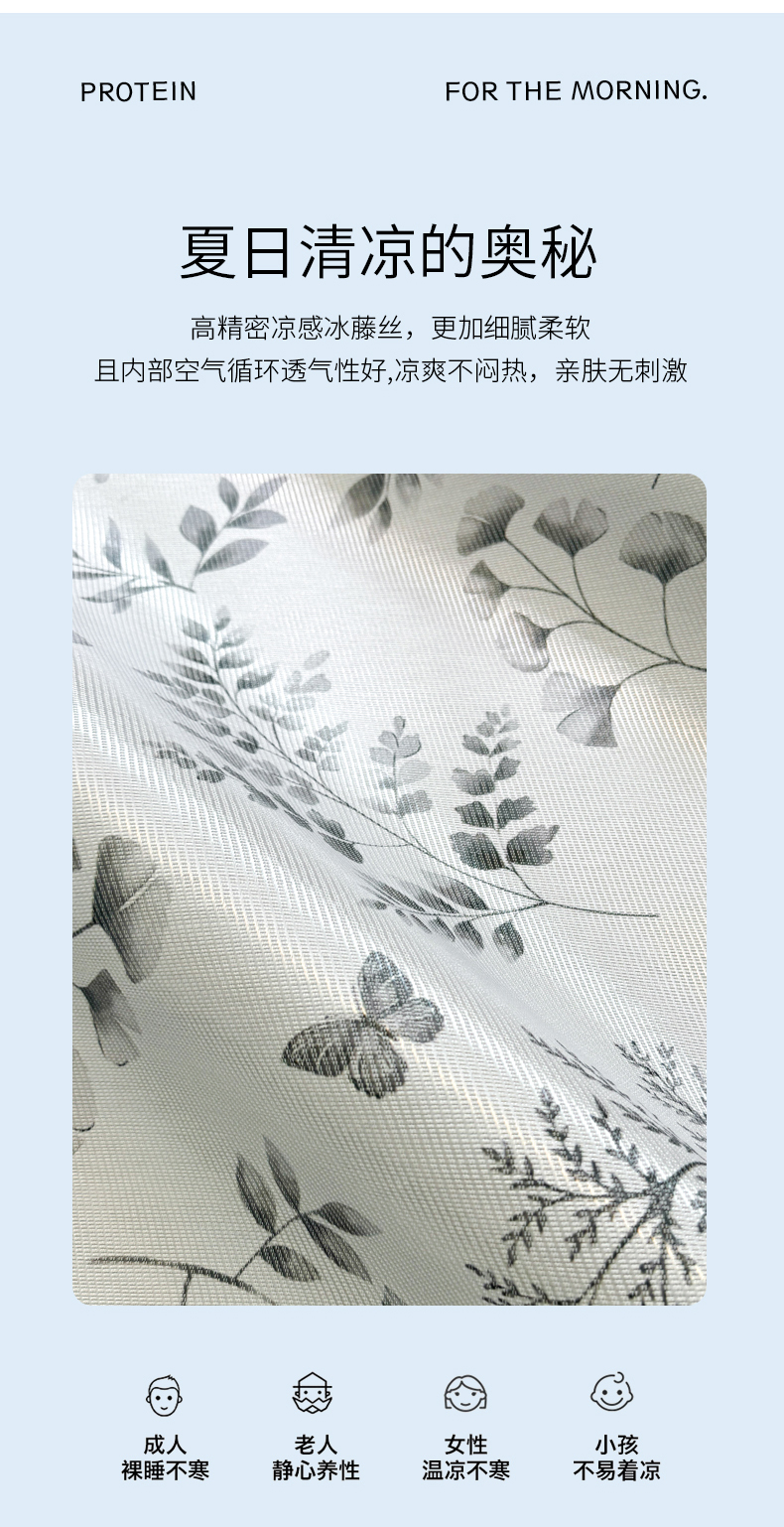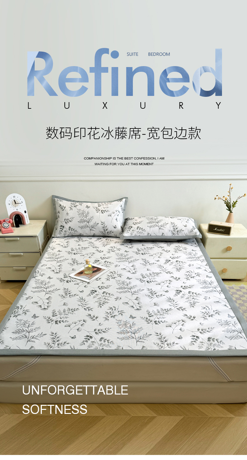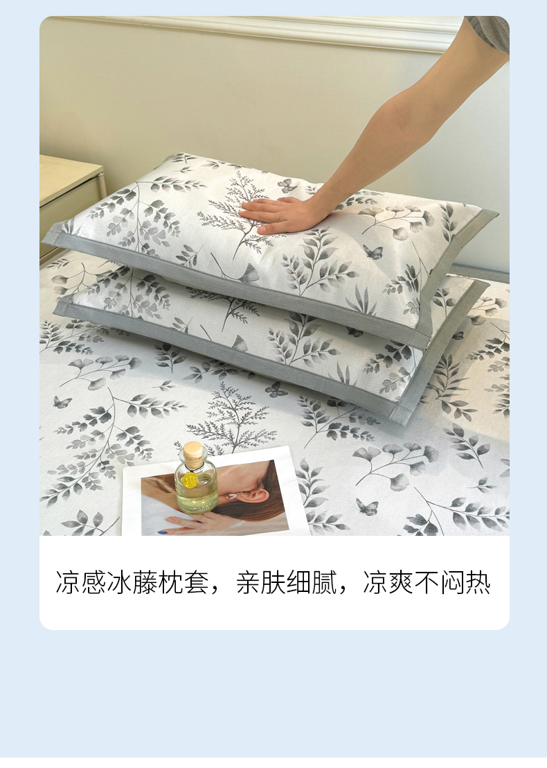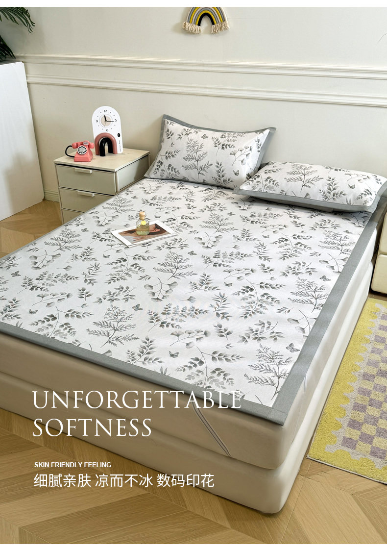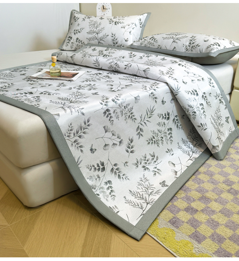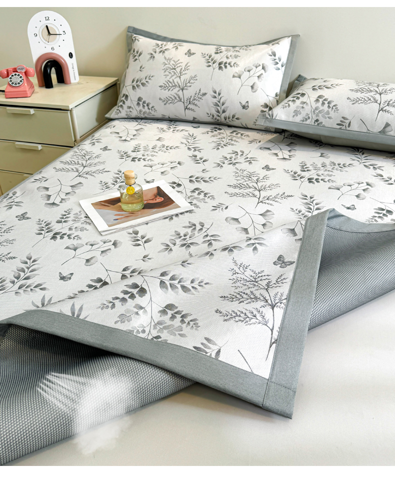 商品名称:LIFE.丽芙 2025春夏季新品数码印花冰藤凉席平铺冰丝凉席印花小清新绑带款三件套(风格二) 水墨叶