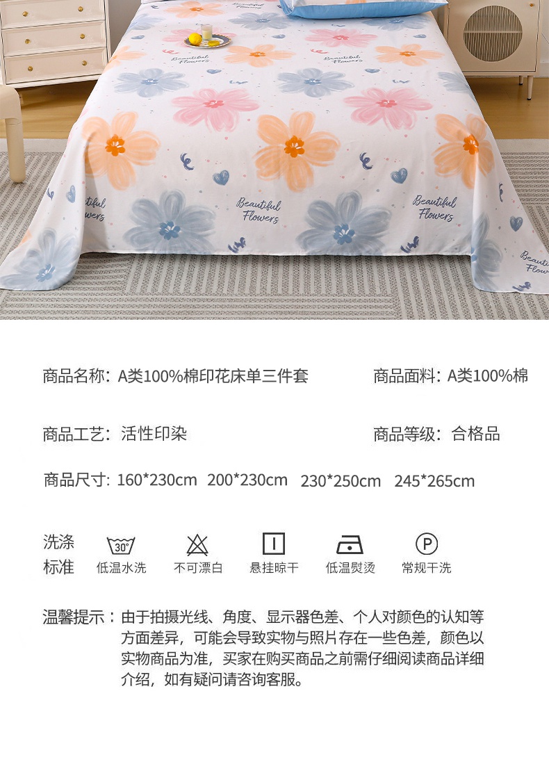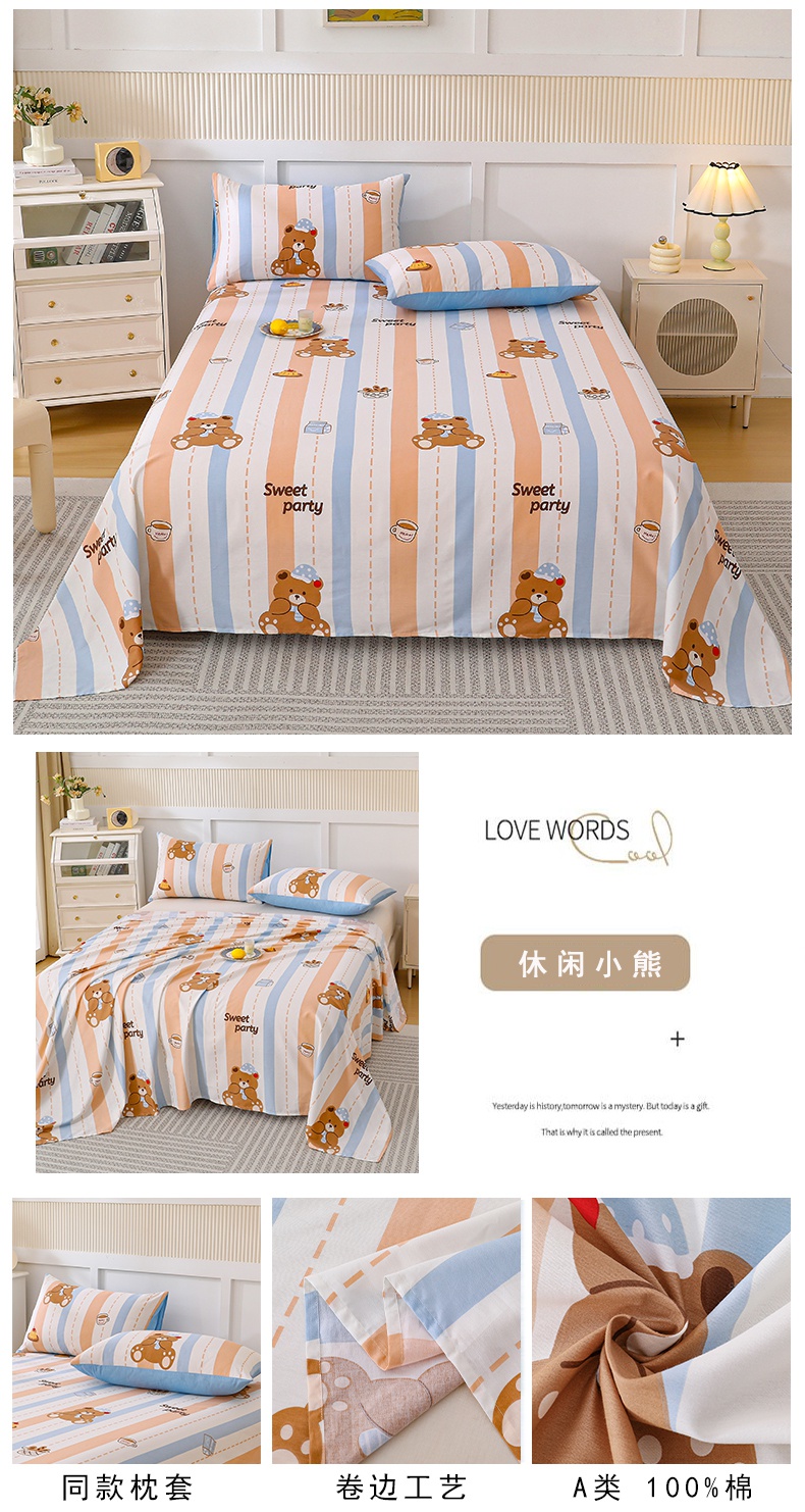商品名称:宇彬家纺 2025直播新款13070全棉纯棉印花双人单床单枕套三件套喷气小清新简约学生被单 恋恋夏日
