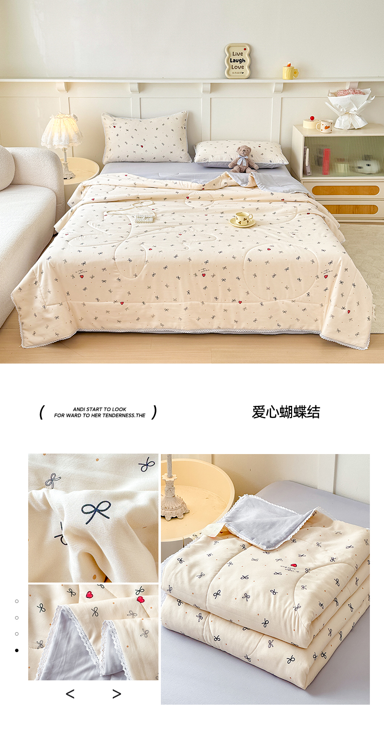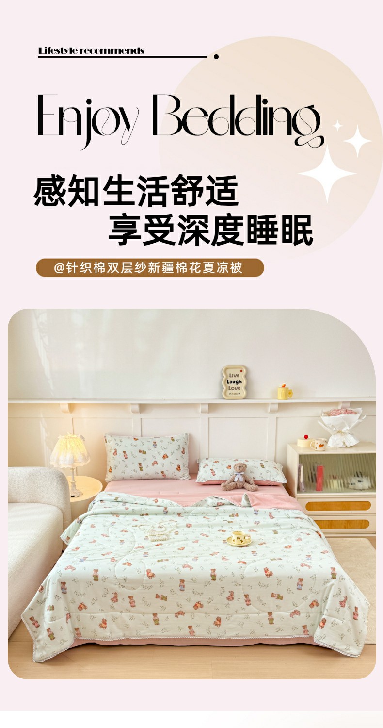 • 91家纺网 家纺一手货源 找家纺 (总)仁凯家纺 2025新款A类针织棉双层纱100%新疆棉花花边夏凉被(包检测)(提供买家秀),格调,花海,咖色蝴蝶结,可爱熊,玫瑰兔,蘑菇森林,倾心南瓜,绅士熊,紫色葡萄
