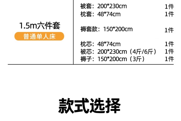 0.9米床套款-六件套(含6斤被芯) | ¥221.00 |