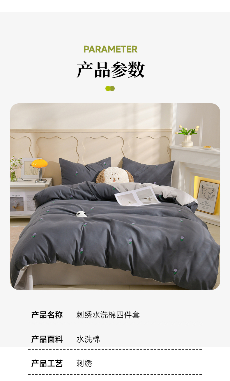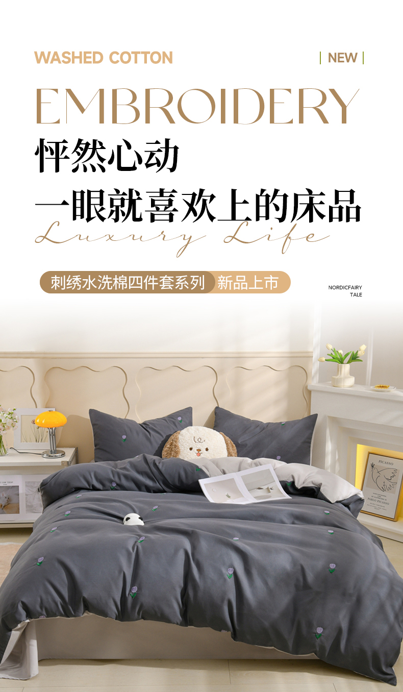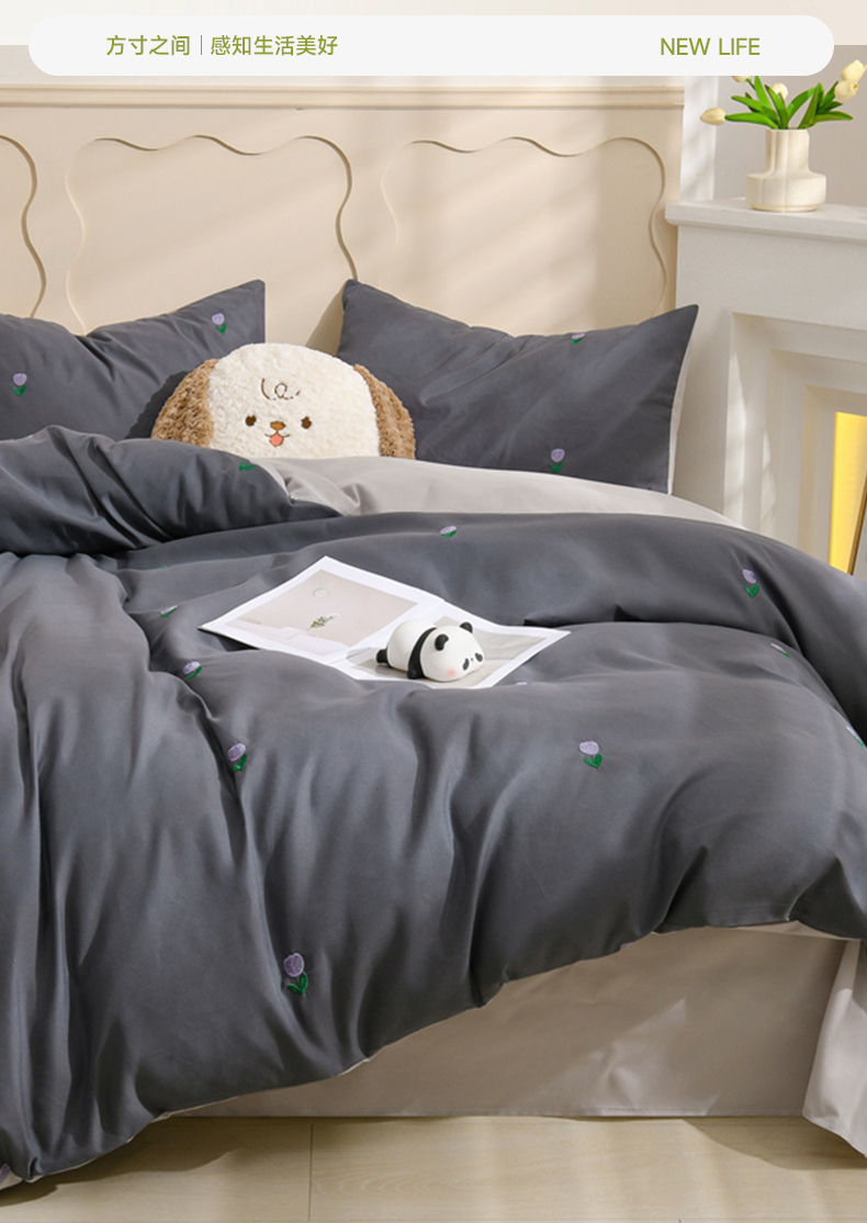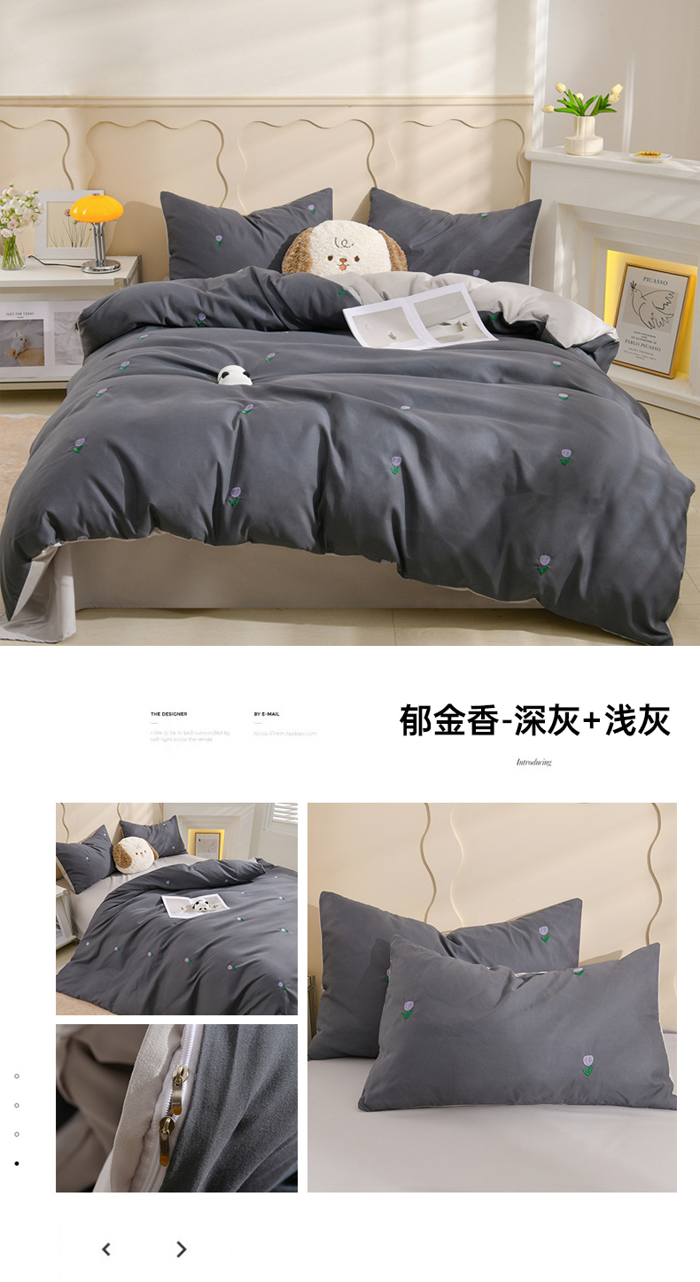 当前位置: 91家纺网 > 商品网购 > 床品套件 > 四件套 > 水洗棉四件套 > 推推家纺 2025新款刺绣水洗棉小清新四件套 郁金香-深灰+浅灰