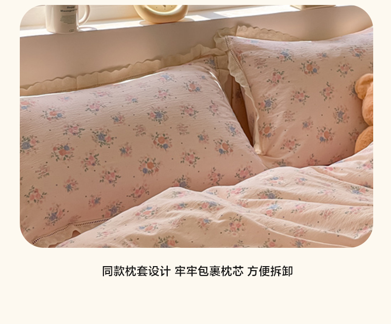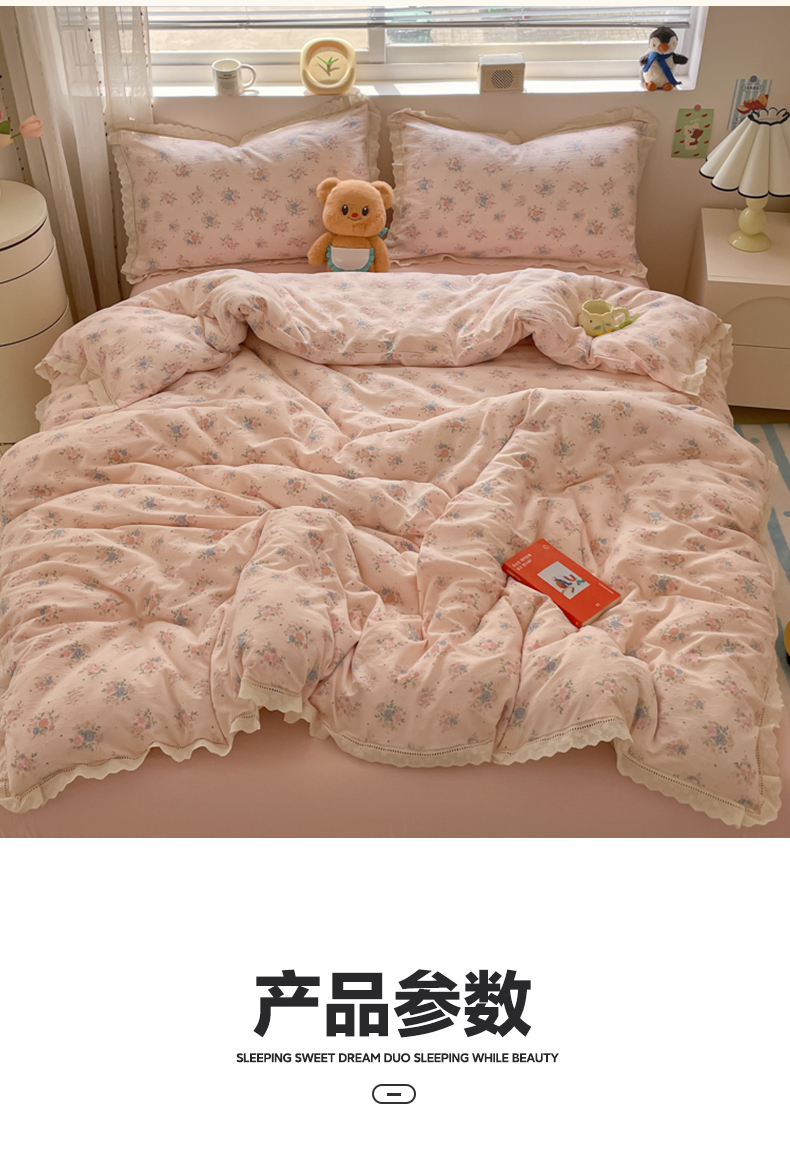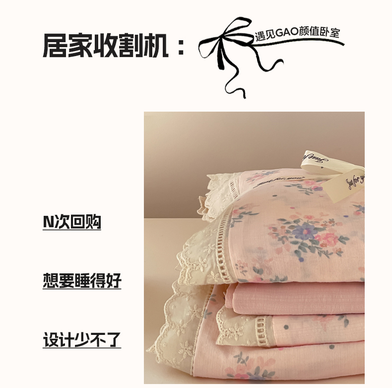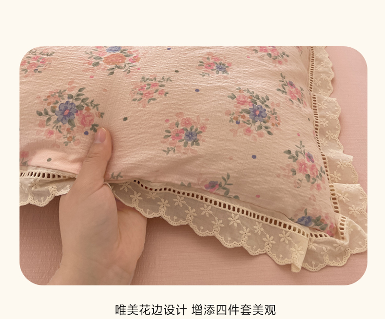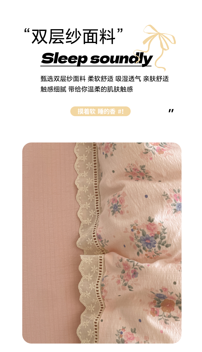 商品名称:玉海棠家纺 2025新款云感双层纱花边四件套 花边-桃夭