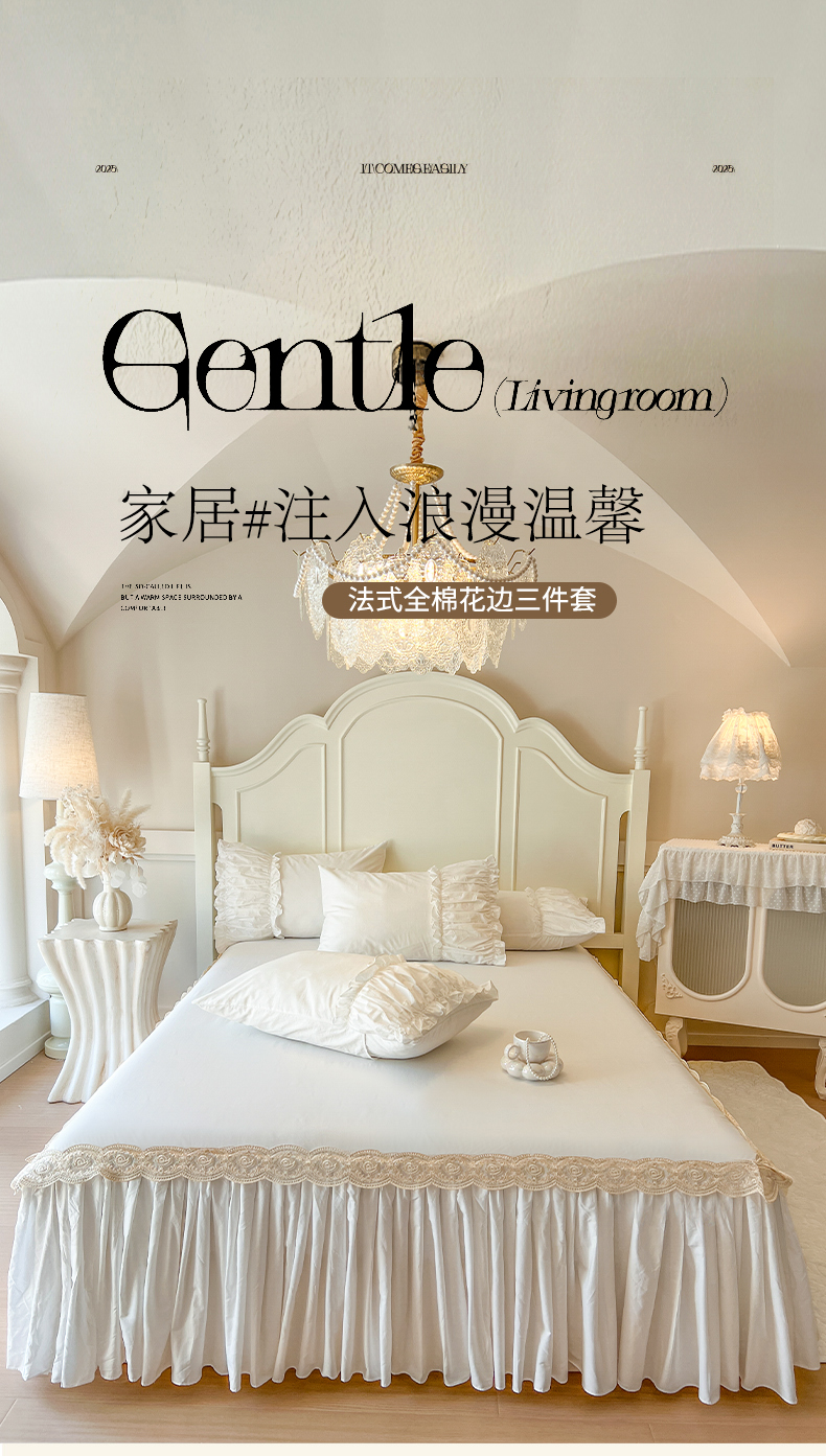 • 91家纺网 家纺一手货源 找家纺 瑞宝 2025新款法式全棉花边维密系列床裙款三件套 维密-奶油白