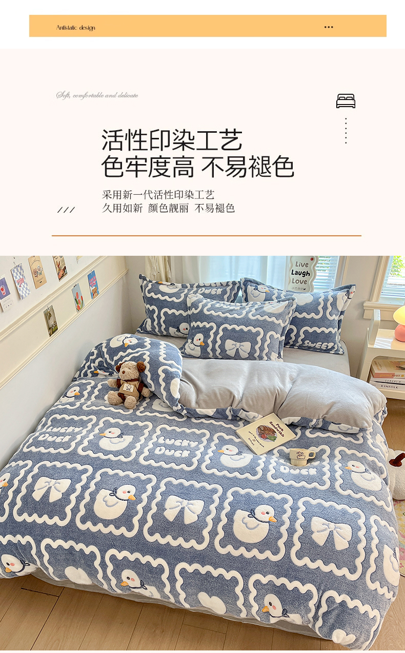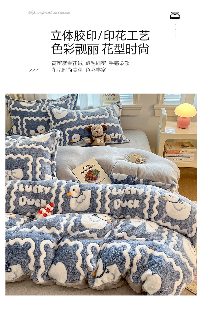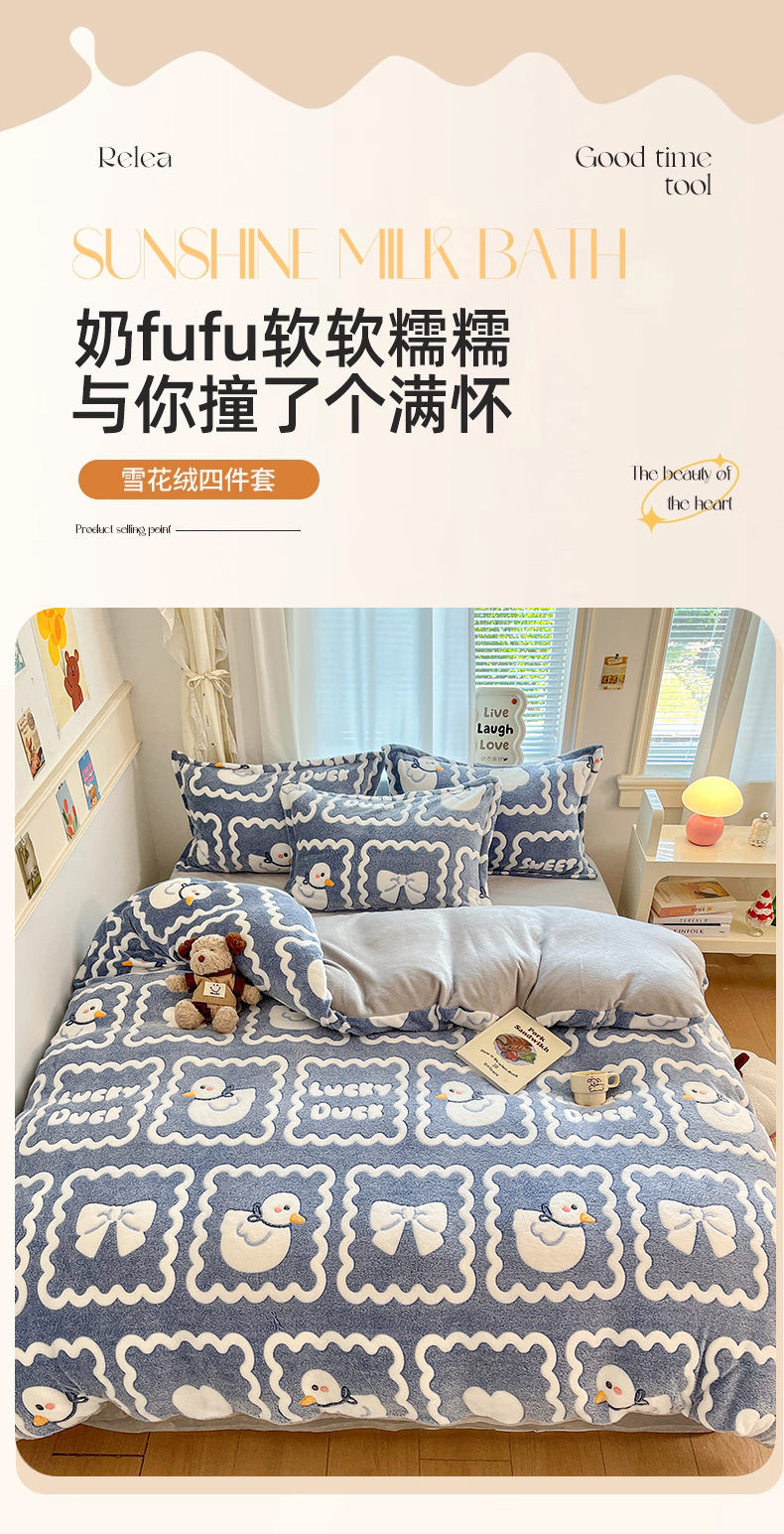 当前位置: 91家纺网 > 商品网购 > 床品套件 > 四件套 > 法莱绒四件套 > 川悦生活 2025新款立体雪花绒印花大床四件套系列一场景二 快乐鸭鸭