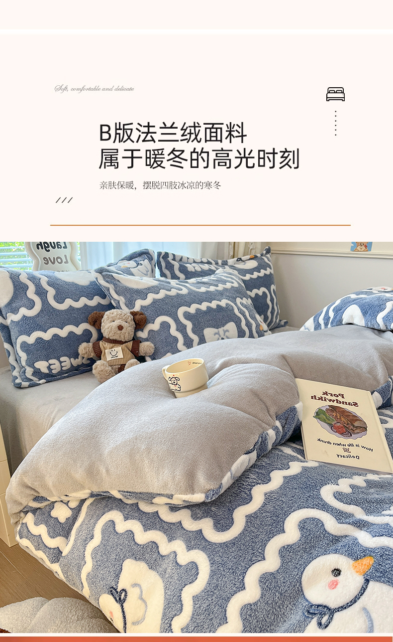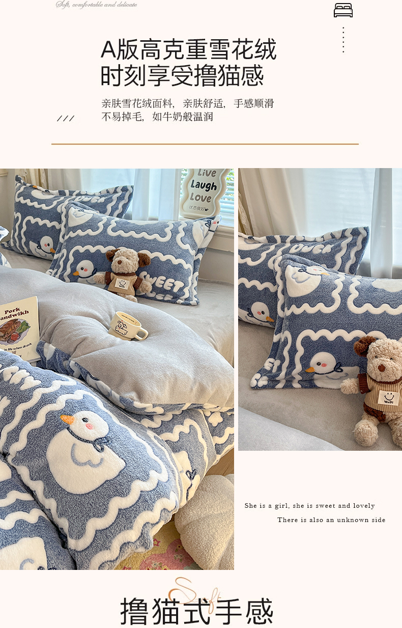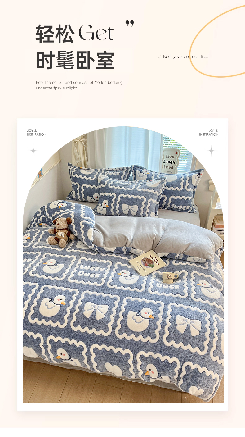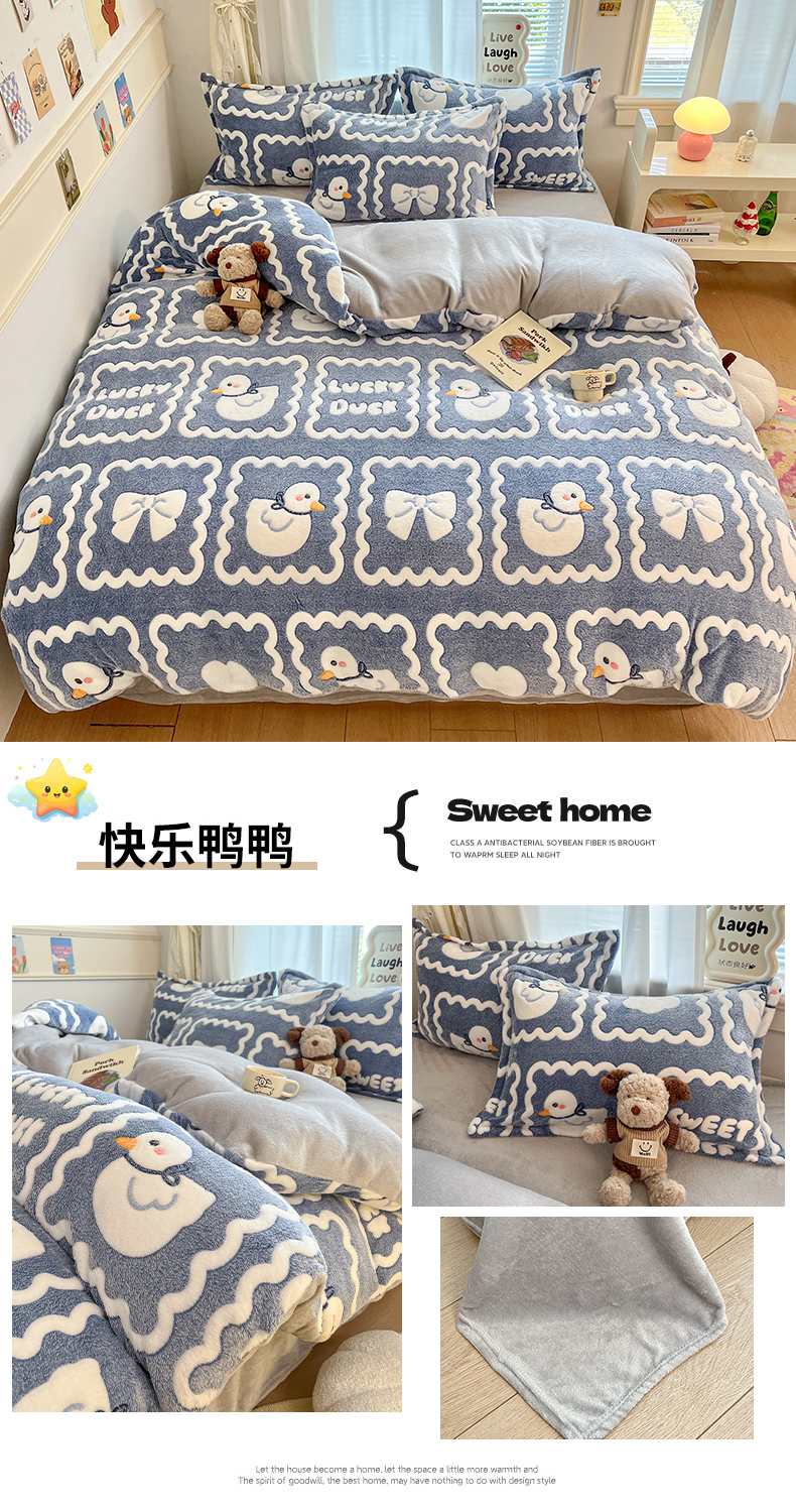 当前位置: 91家纺网 > 商品网购 > 床品套件 > 四件套 > 法莱绒四件套 > 川悦生活 2025新款立体雪花绒印花大床四件套系列一场景二 快乐鸭鸭