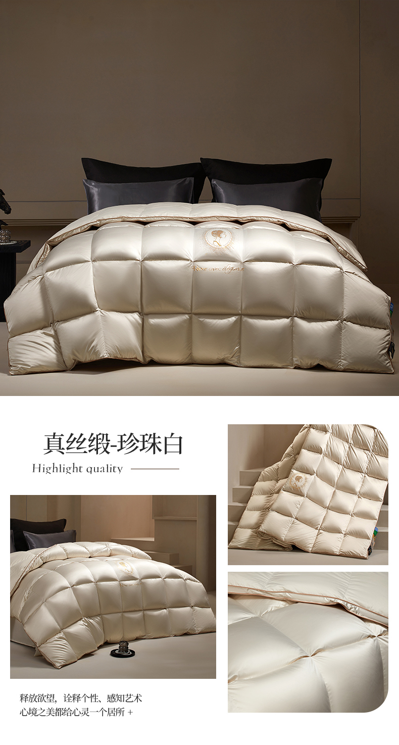 • 91家纺网 家纺一手货源 找家纺 织梦人羽绒工厂店 2025新款高蓬松羽绒羽毛被大牌同款花型-真丝缎米字系列 贵夫人真丝缎-珍珠白
