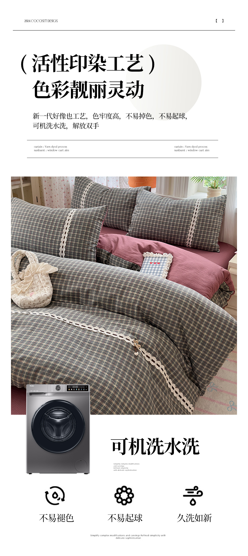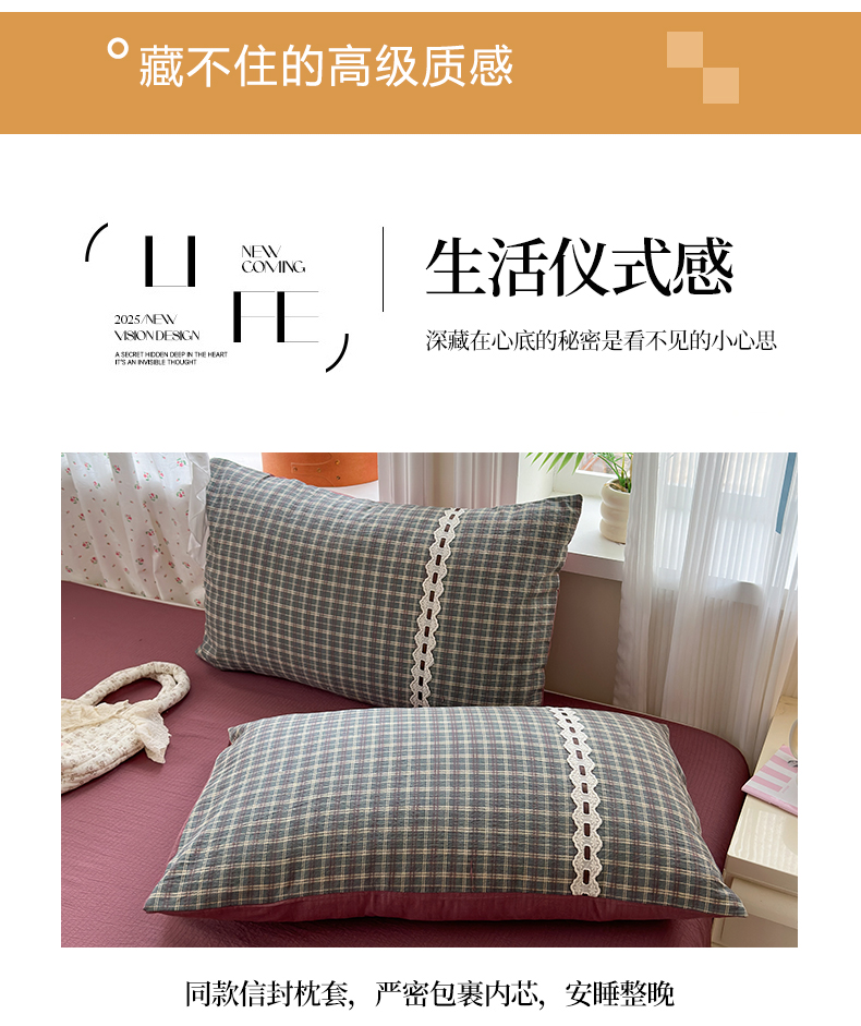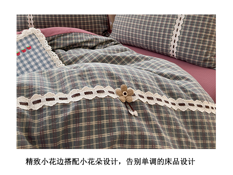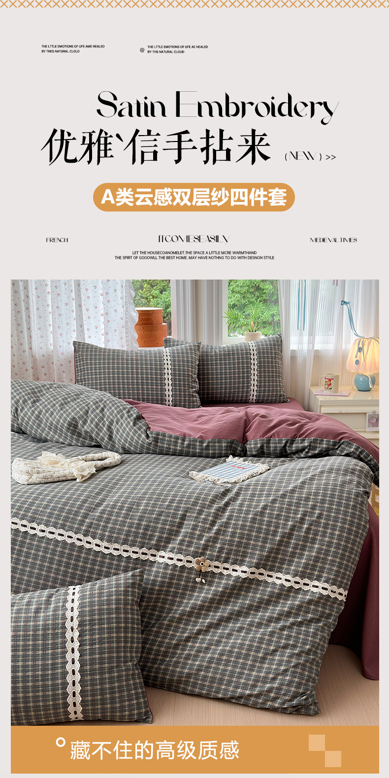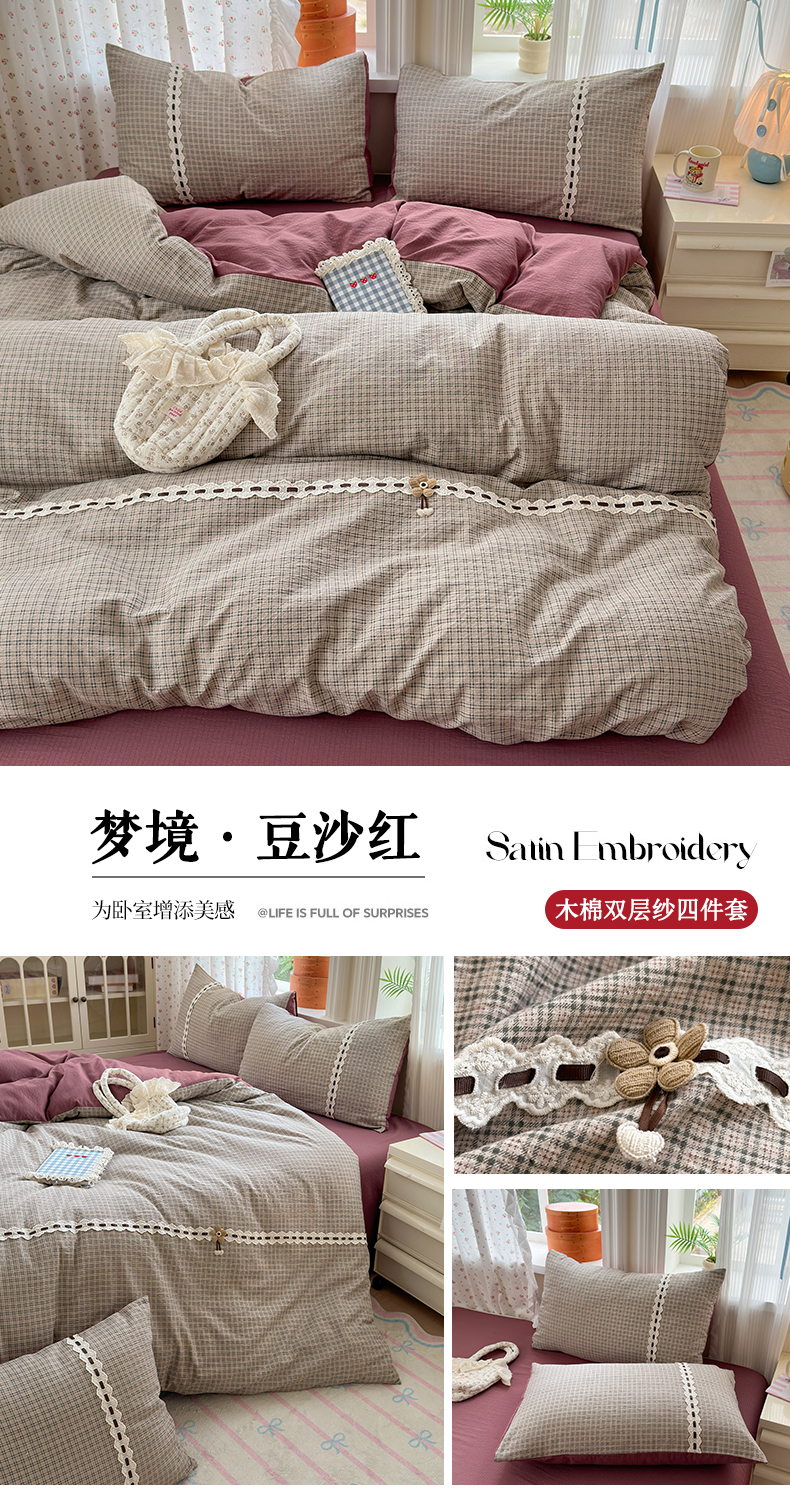 (总)晚爱家纺(原晚安家居) 2025新款韩系少女风蕾丝花边四件套云感木棉双层纱-苏菲,苏菲·红绿格,苏菲·大红格,苏菲·浅咖格,苏菲·浅蓝格,苏菲·浅绿格,苏菲·深咖格