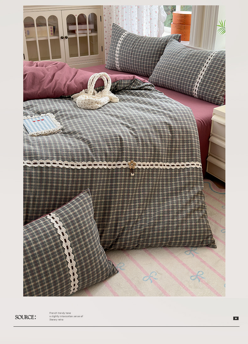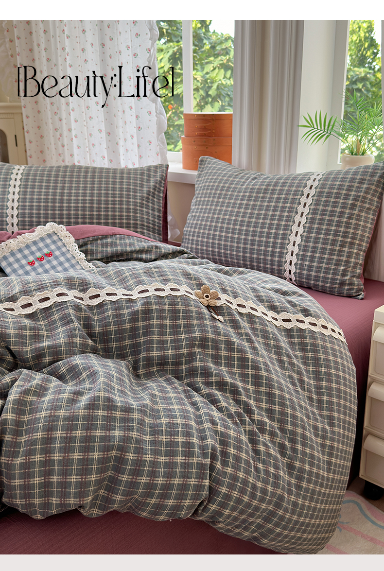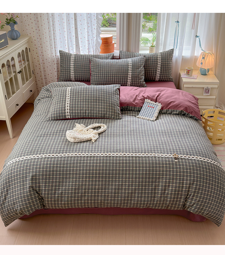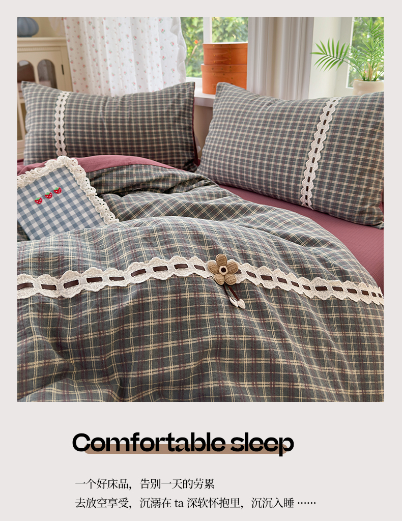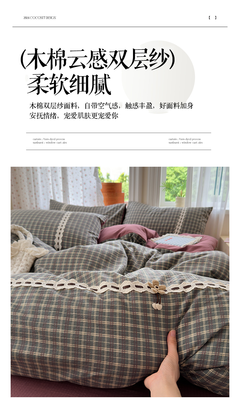 (总)晚爱家纺(原晚安家居) 2025新款韩系少女风蕾丝花边四件套云感木棉双层纱-苏菲,苏菲·红绿格,苏菲·大红格,苏菲·浅咖格,苏菲·浅蓝格,苏菲·浅绿格,苏菲·深咖格