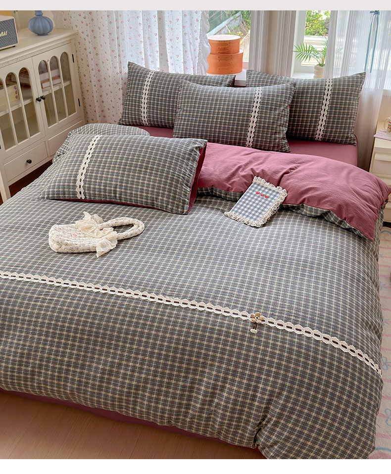 (总)晚爱家纺(原晚安家居) 2025无印风四件套经典格子超柔水洗棉四件套,大粉格,大蓝格,灰白格,灰粉格,小蓝格,小绿格