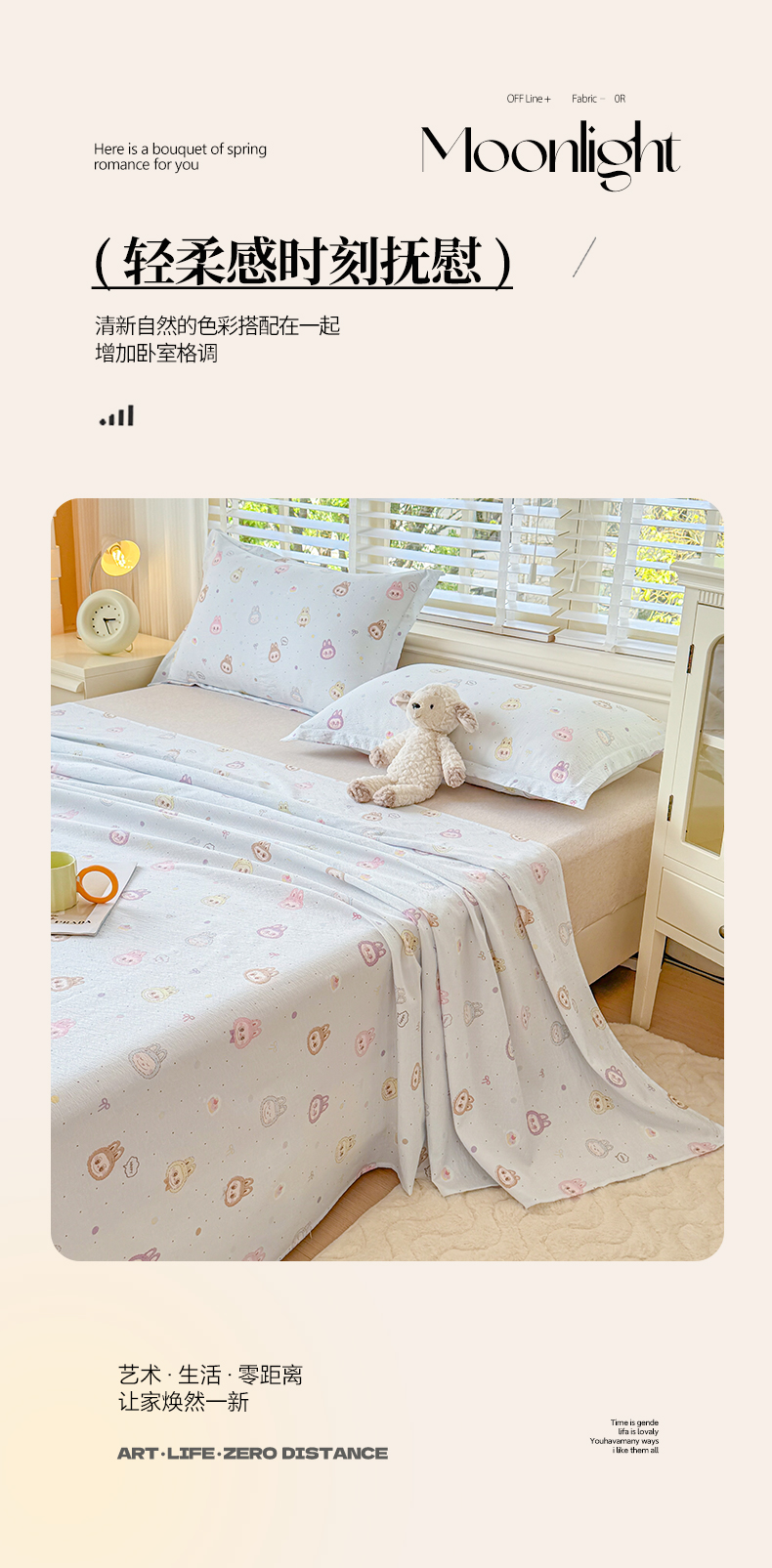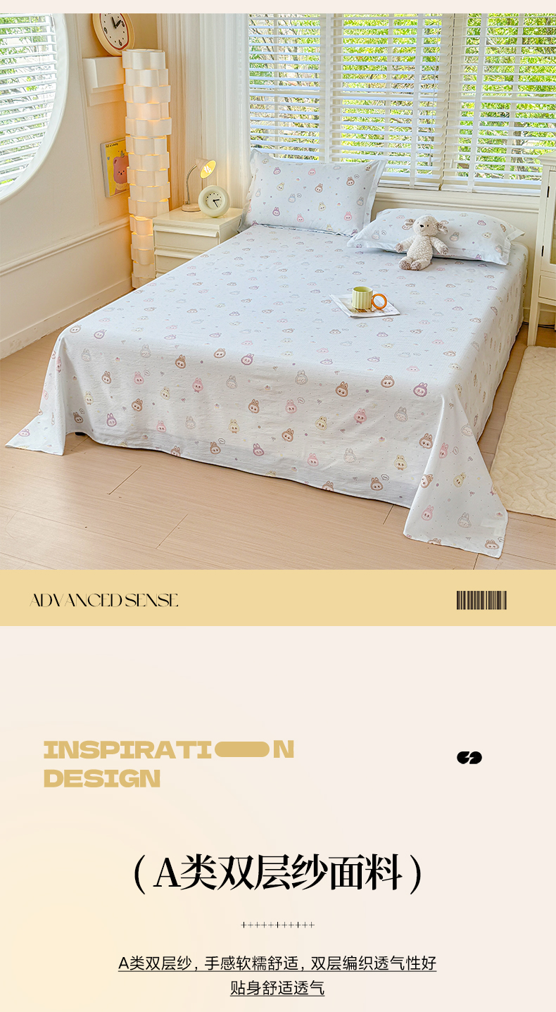 • 91家纺网 家纺一手货源 找家纺 一诺家居 2025新款A类云感双层纱针织棉印花母婴级裸睡床单三件套 量大可优惠 量大可送货 海盐耶耶