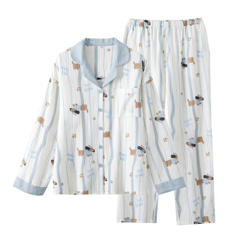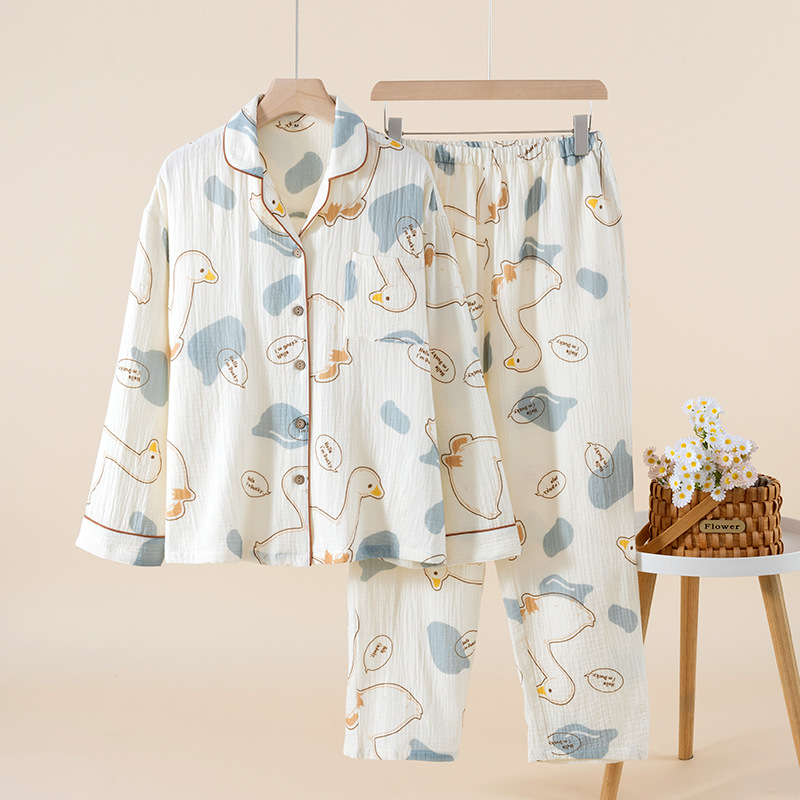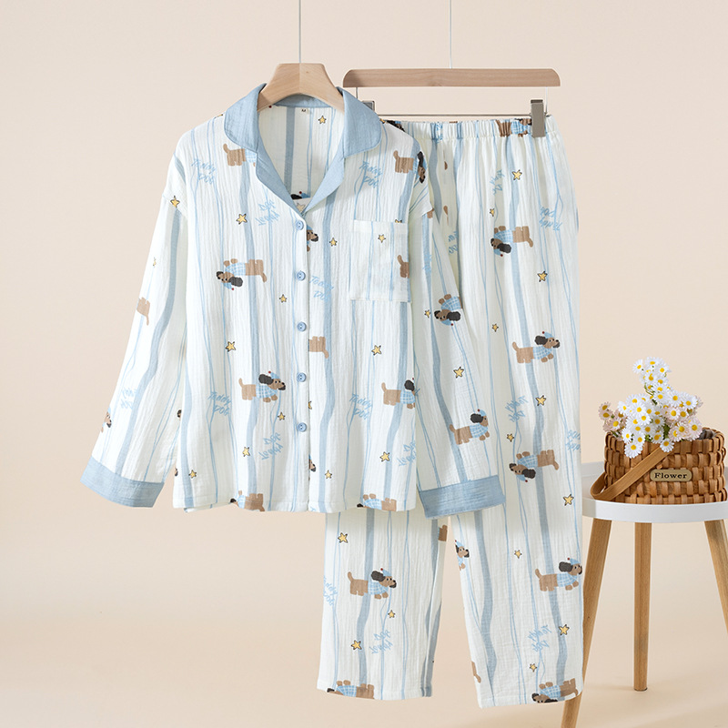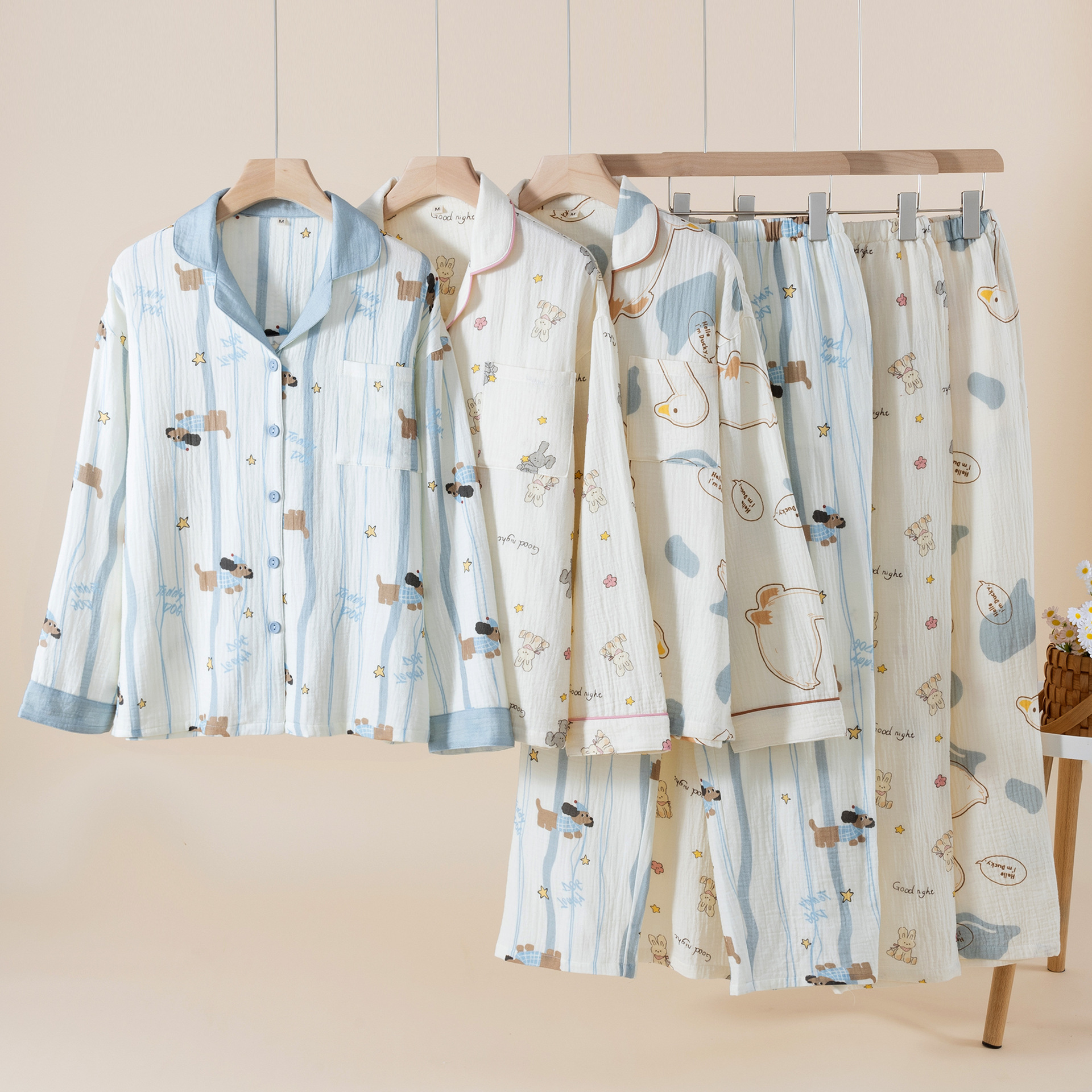 (总)洛兰沙家居馆【只代发】【只代发】2025新款日系简约纯棉双层纱绉布女士睡衣春秋夏季薄款长袖长裤可外穿家居服