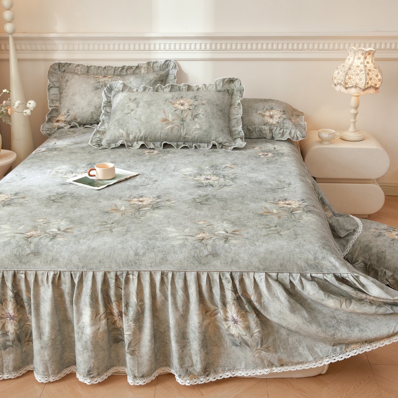 • 91家纺网 家纺一手货源 找家纺 缦彩 全棉A类100%数码印花床裙遮丑花边床单床罩单品 梦境-灰
