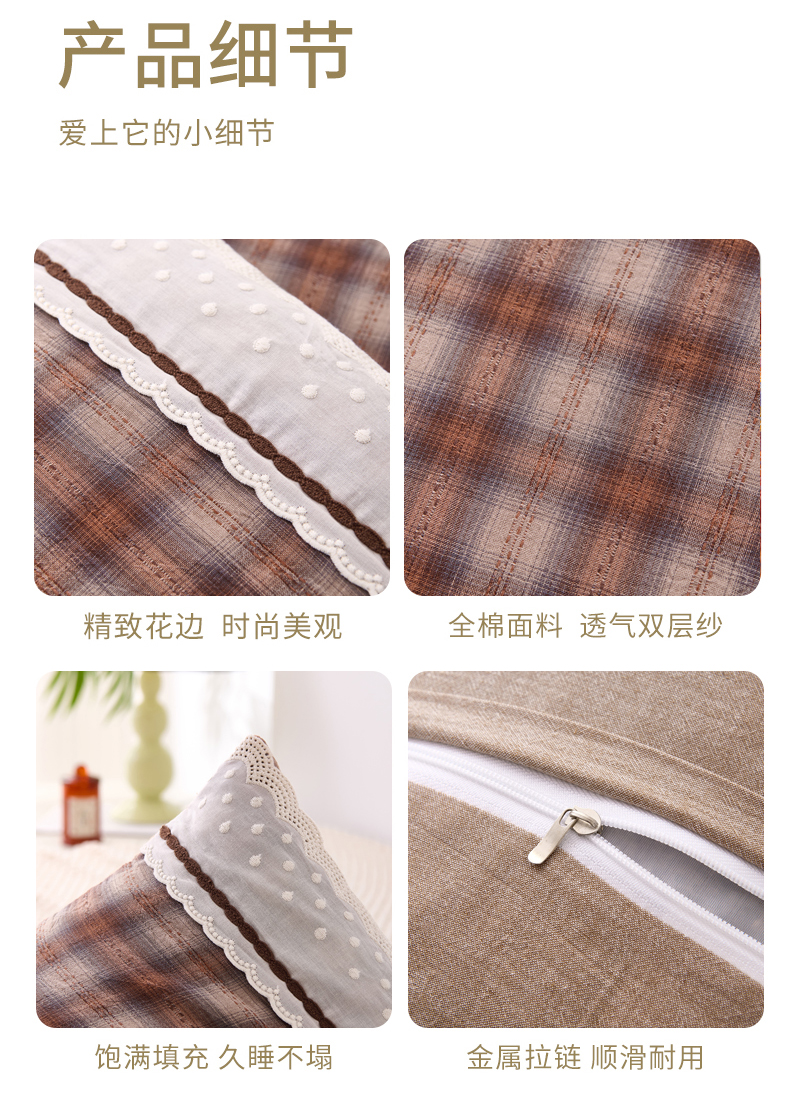 商品名称:大熊枕芯 2025新款 全棉花边荞麦枕 格子花边-咖