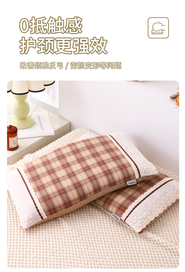 大熊枕芯 2025新款 全棉花边荞麦枕 格子花边-咖