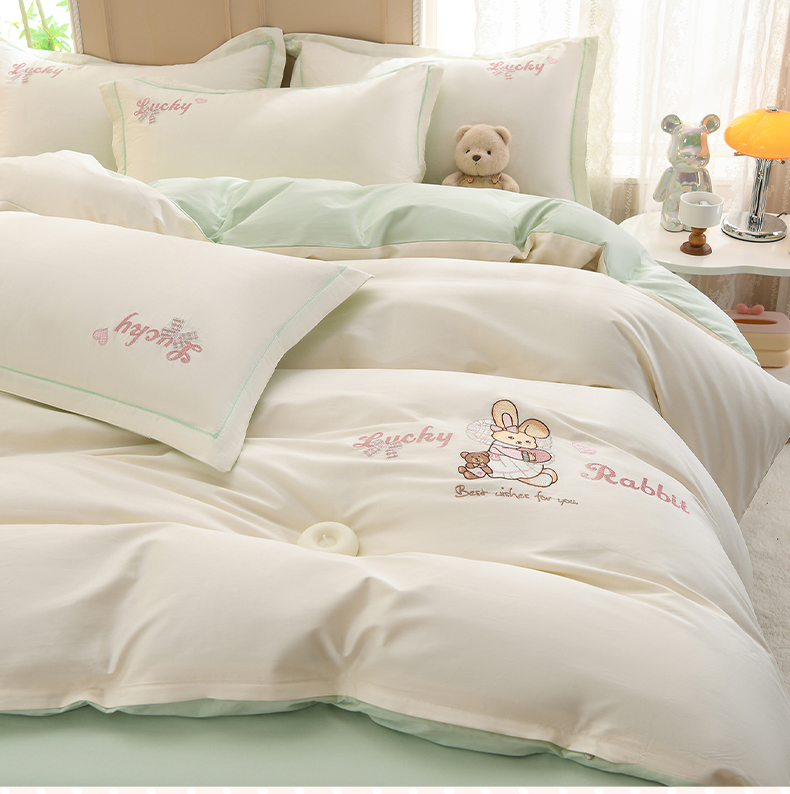商品名称:绒小宣 2025新款13372全棉绣花四件套-梦幻兔 兔熊-白青