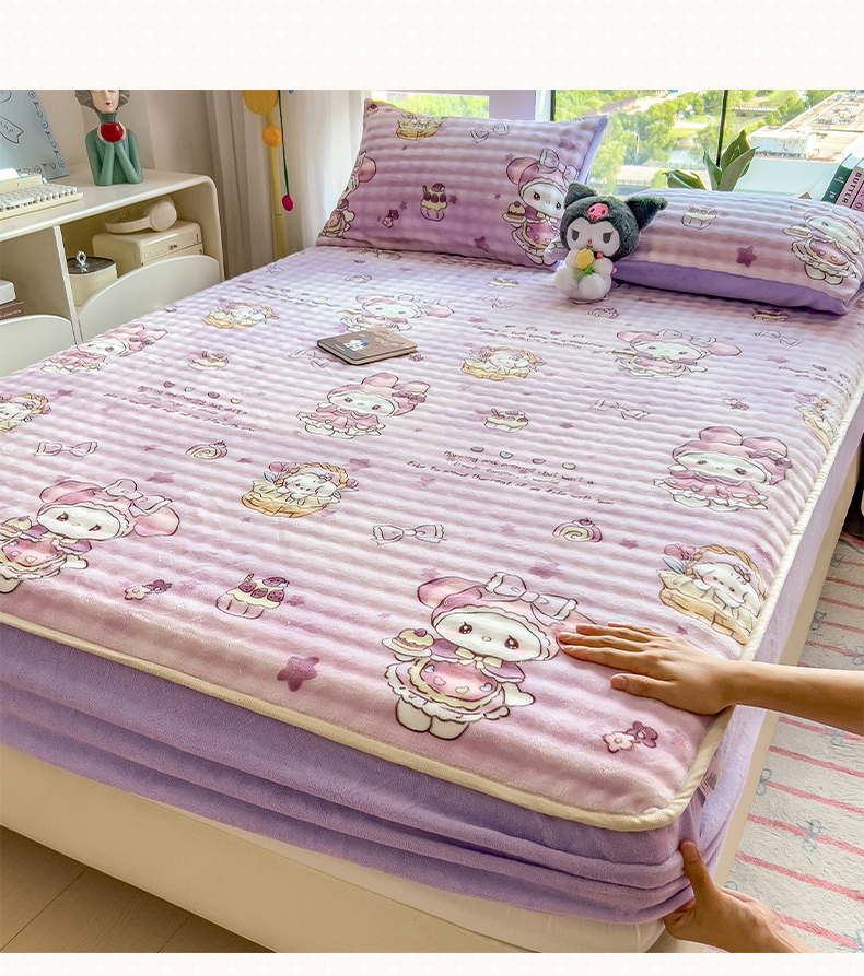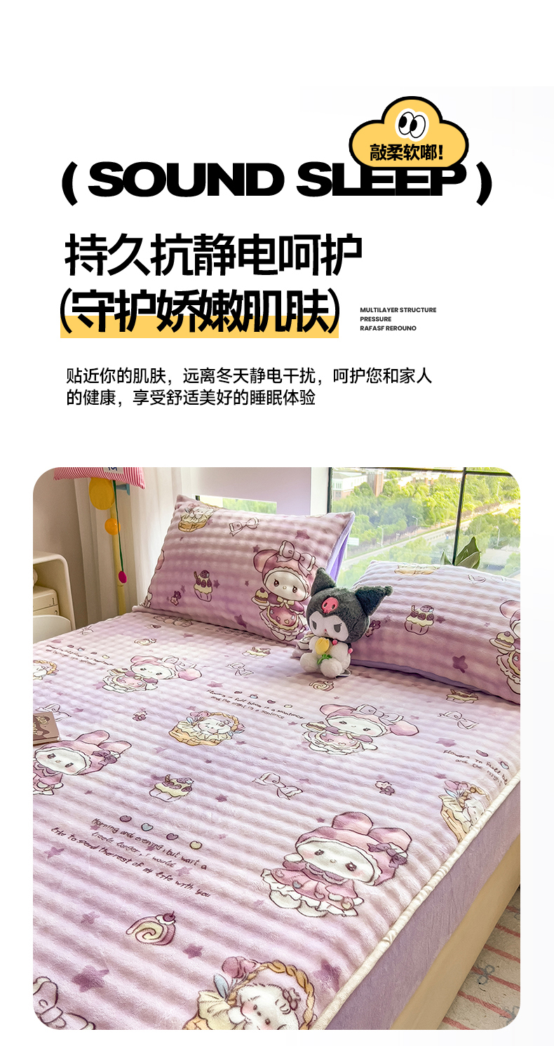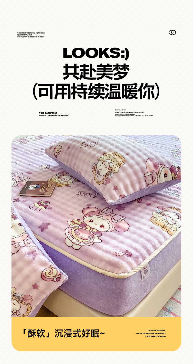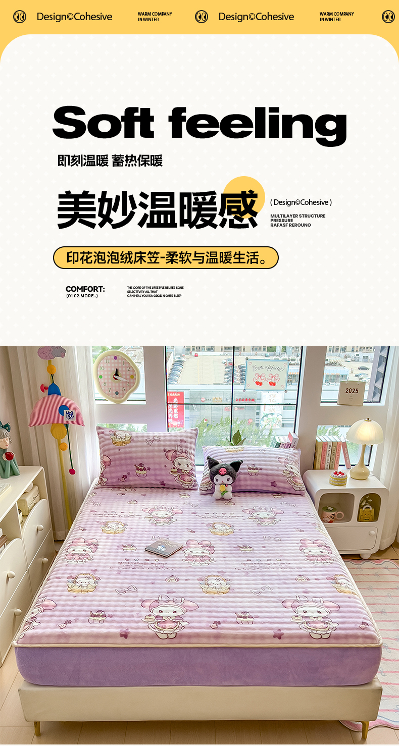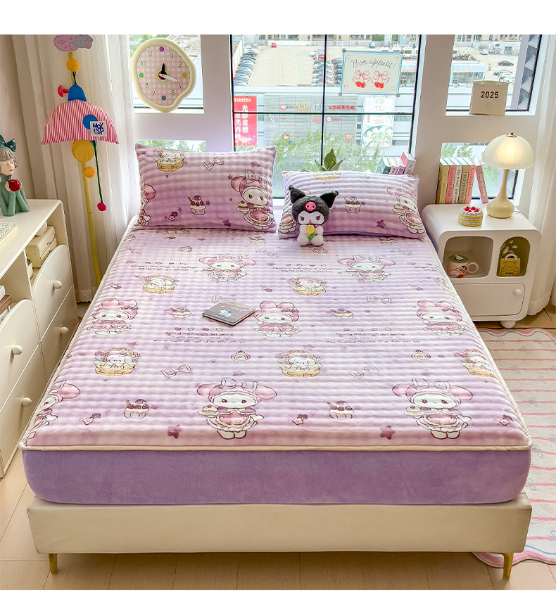 • 91家纺网 家纺一手货源 找家纺 摩妮卡 2025新款加厚牛奶绒泡泡绒床笠三件套 蝴蝶结美乐蒂