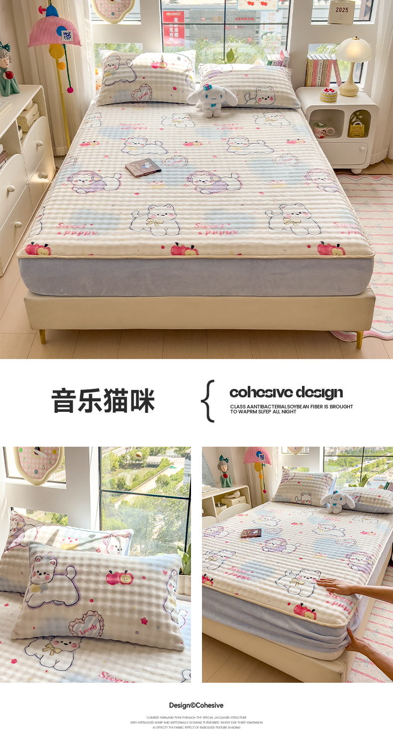 (总)摩妮卡 2025新款加厚保暖牛奶绒夹棉绣花床垫三件套,呆呆熊-蓝,呆呆熊-黄,呆呆熊-咖,Kitty猫-白,Kitty猫-粉,Kitty猫-紫