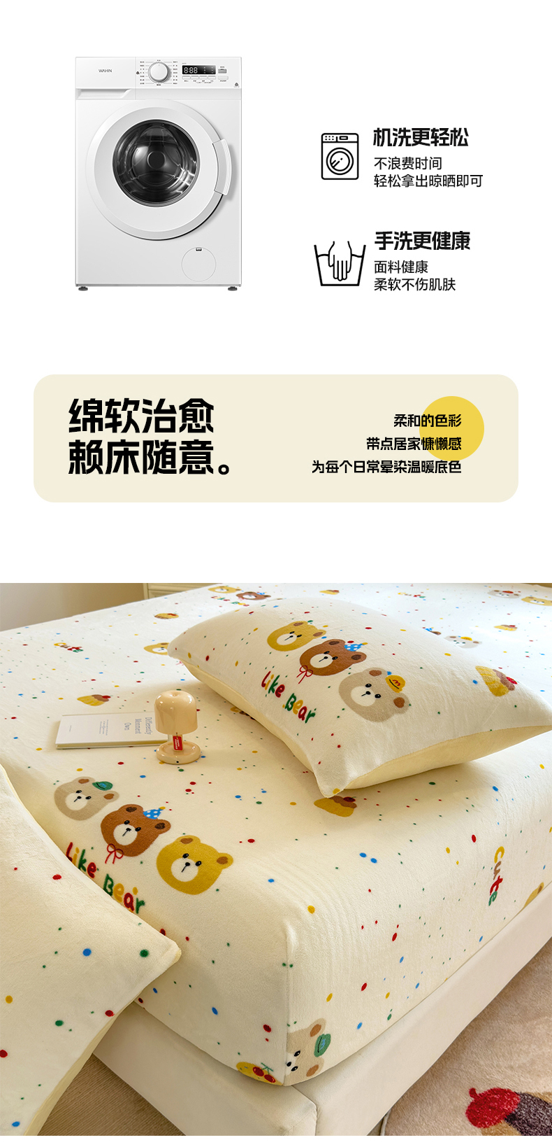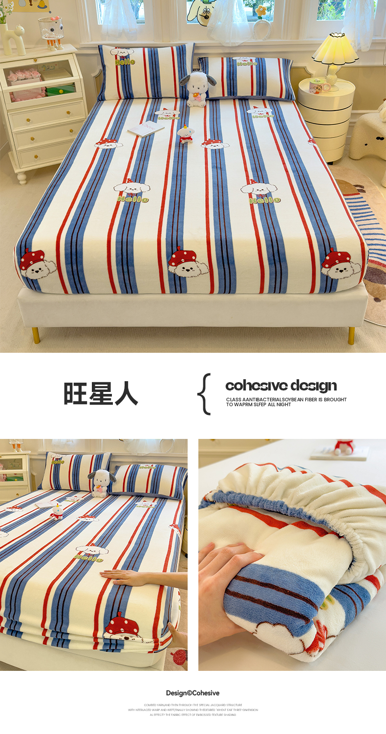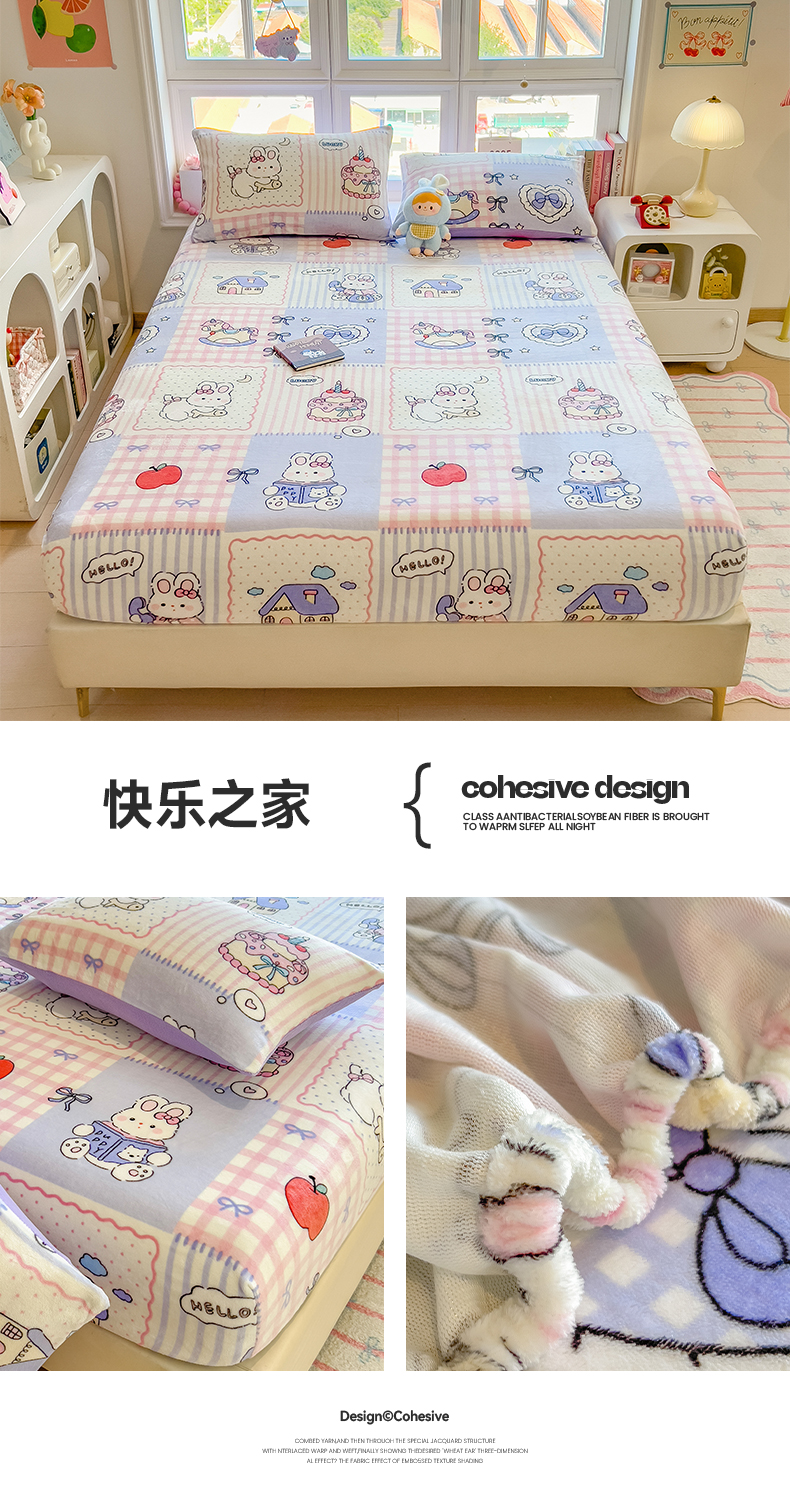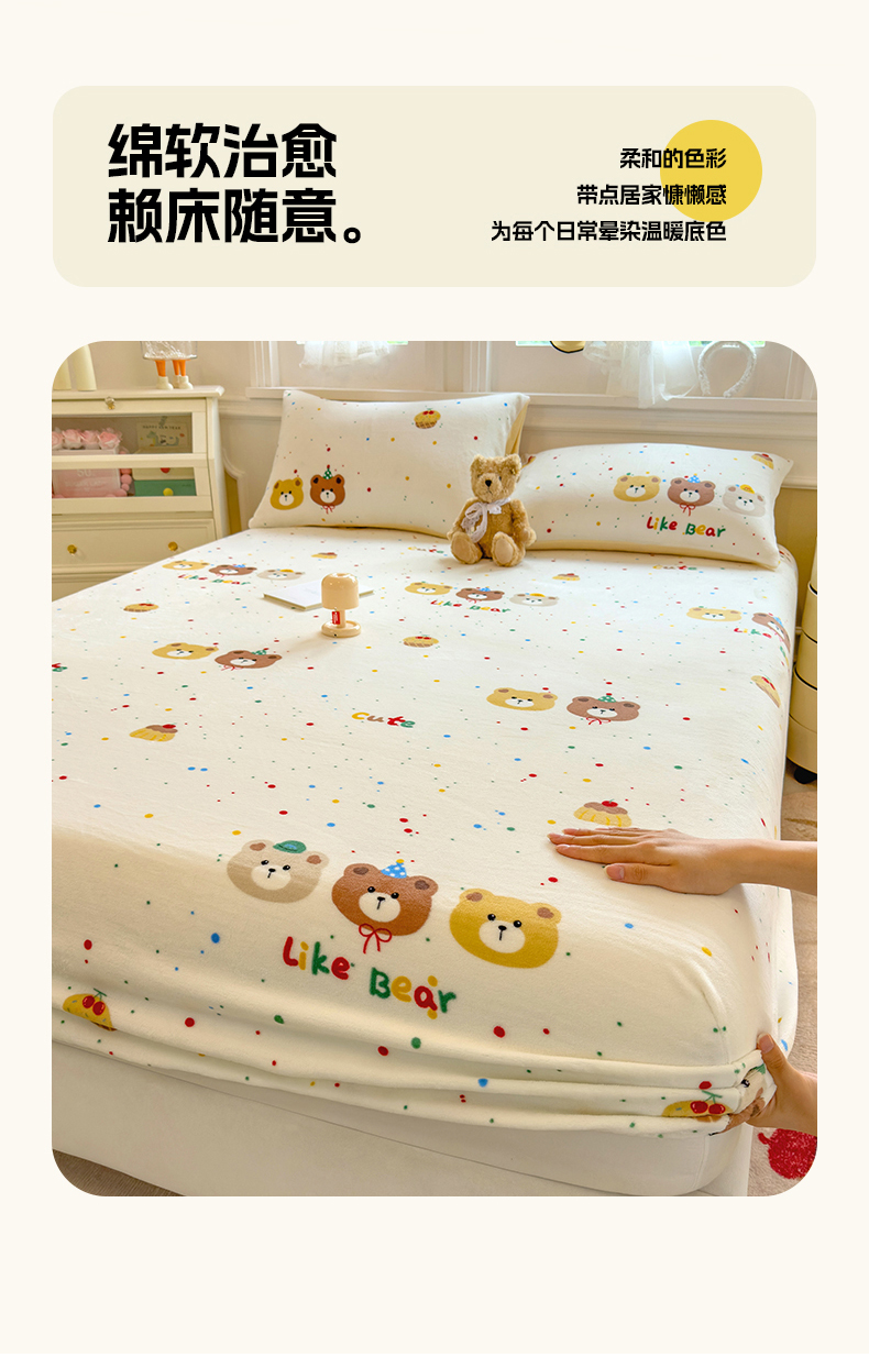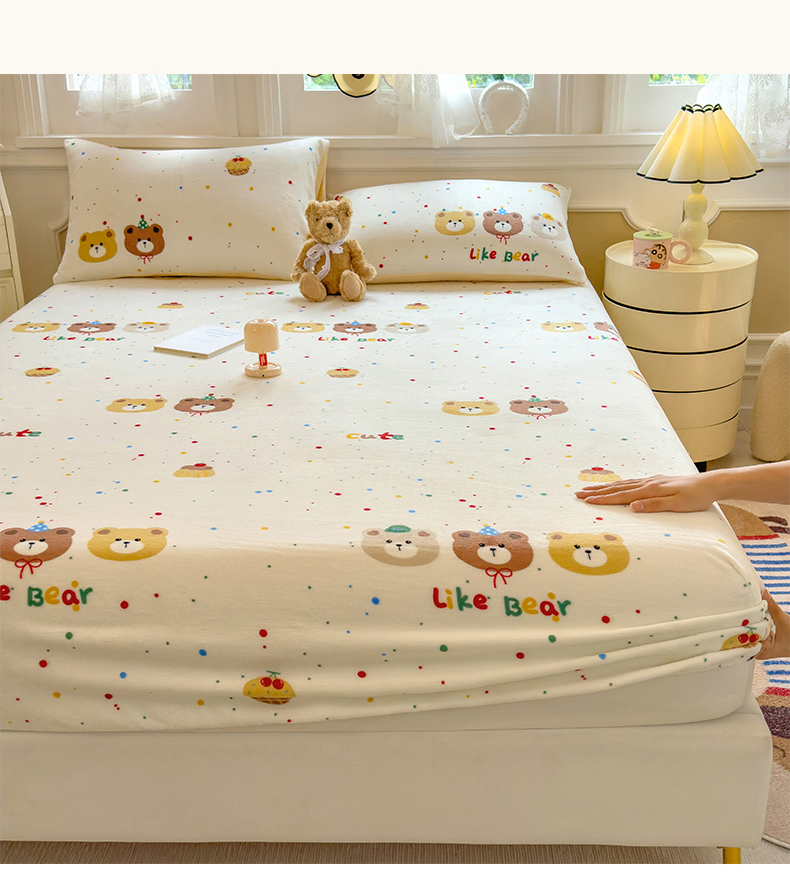 • 91家纺网 家纺一手货源 找家纺 摩妮卡 2025新款印花系列小清新牛奶绒印花床笠三件套 三只小熊