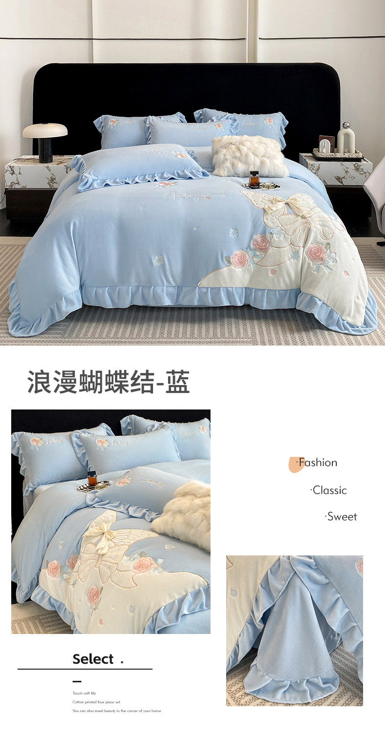 当前位置: 91家纺网 > 商品网购 > 床品套件 > 四件套 > 牛奶绒四件套 > 绒棉世家 2025秋冬新款A类牛奶绒宝宝绒刺绣韩版系列-浪漫蝴蝶结 浪漫蝴蝶结-蓝