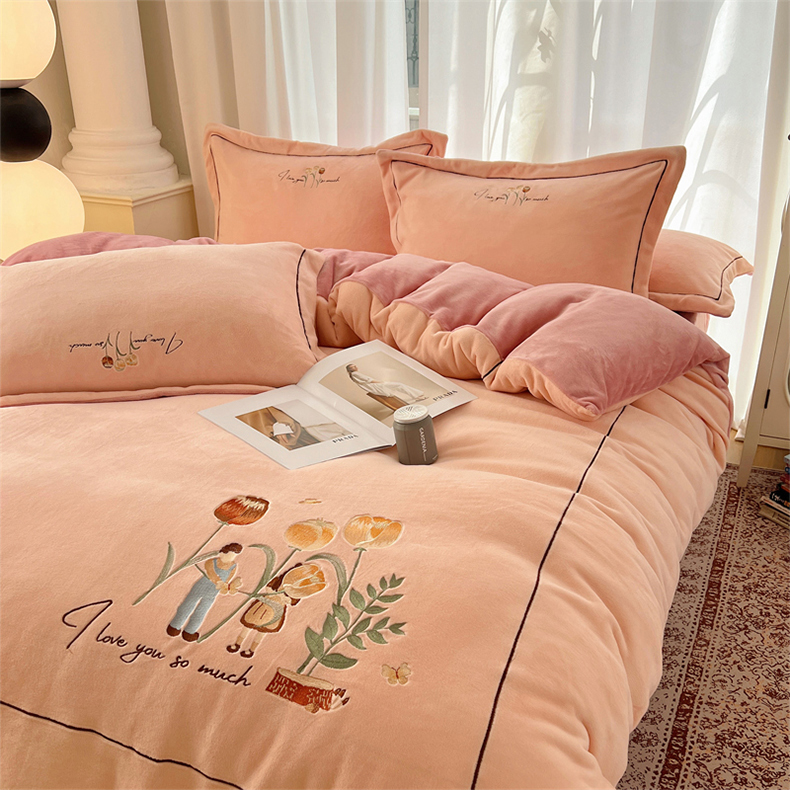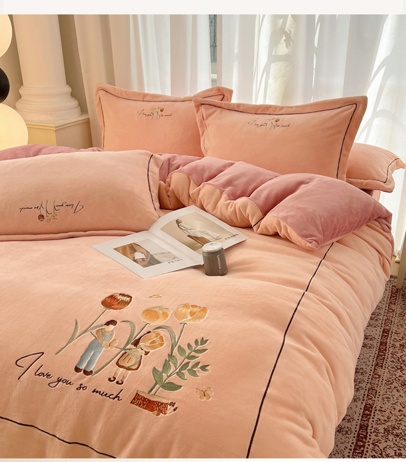 丽涵家纺 2025新款全工艺消光锦芙绒绣花四件套 粉豆沙