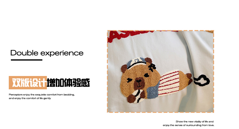 (总)炫拼家纺 2025春夏新款全棉纯棉A类40支双层纱卡通毛巾绣四件套-慕斯,趣味猫,红军兔,晚安狗,哈尼熊,汉堡卡皮,奶油狗