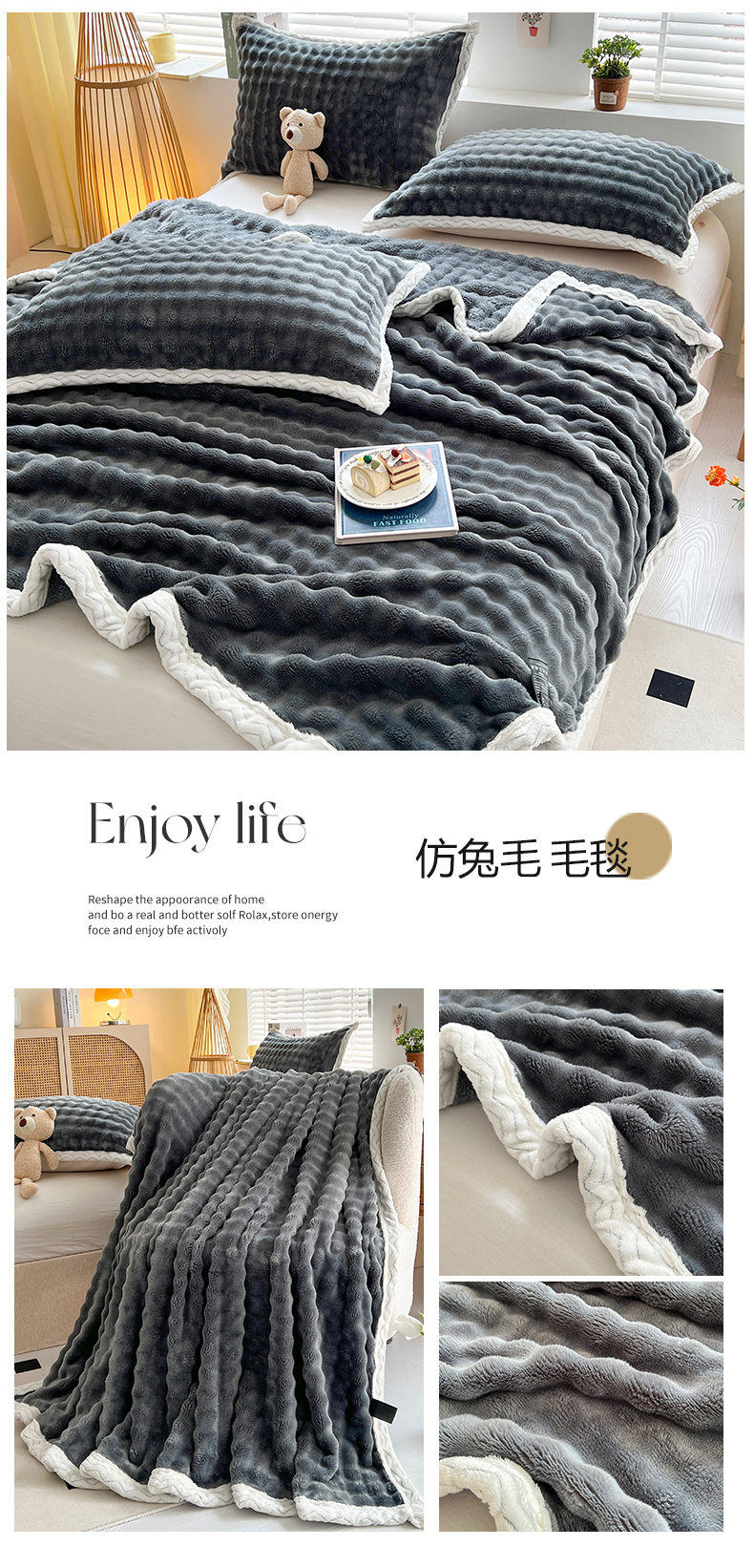 商品名称:栩裕纺织 2025新款简约仿兔毛泡泡绒毛毯系列-包边款 浅驼