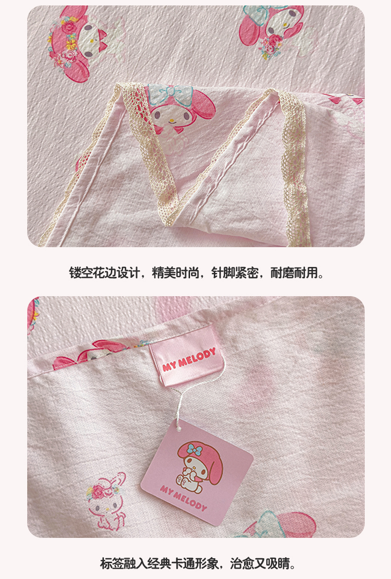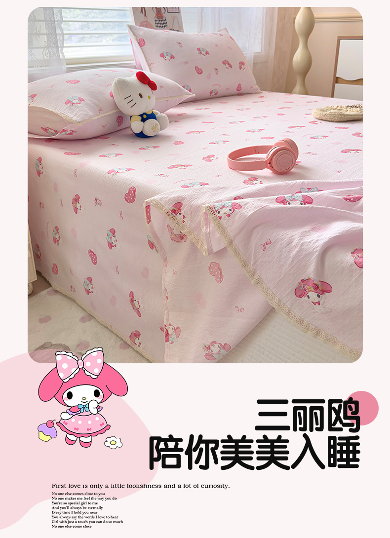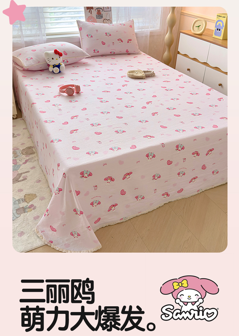 当前位置: 91家纺网 > 商品网购 > 床上用品 > 床单 > 梦庭帛美 2025新款高克重110克云感提花皱皱纱正版三丽鸥床单 童趣美乐蒂
