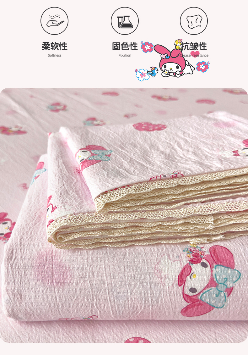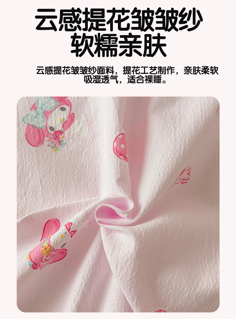 • 91家纺网 家纺一手货源 找家纺 梦庭帛美 2025新款高克重110克云感提花皱皱纱正版三丽鸥床单 童趣美乐蒂