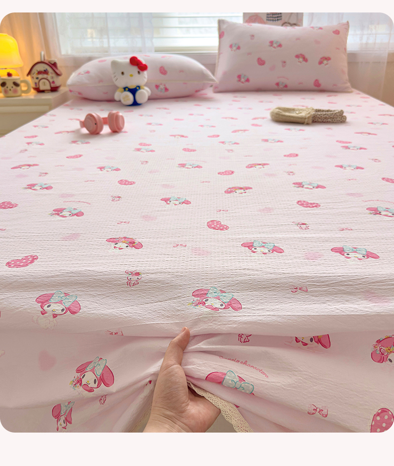 (总)梦庭帛美 2025新款高克重110克云感提花皱皱纱正版三丽鸥床笠,甜蜜电话-粉,条纹KT,童趣美乐蒂,彩绘小奶猫,木马美乐蒂,时尚库洛米,甜蜜电话-蓝,粉樱凯蒂,奶芙KT