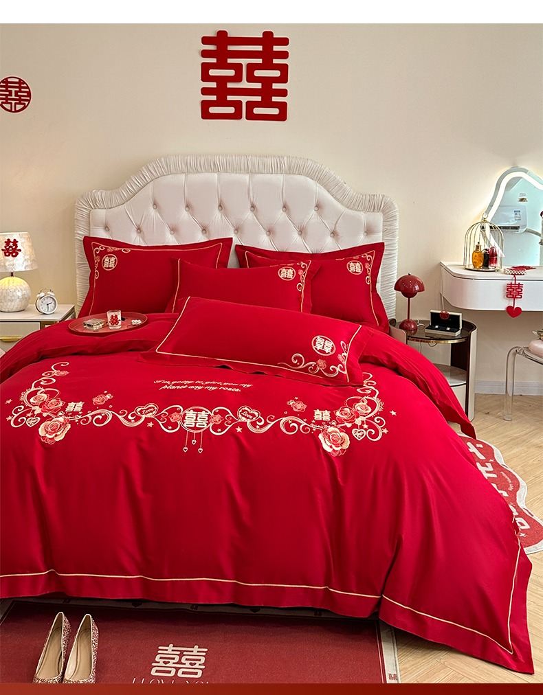 (总)金麦家纺 2025新款亲肤磨毛刺绣婚庆四件套,大喜,喜结良缘,喜愿,吾家有喜,喜爱,玫瑰有约