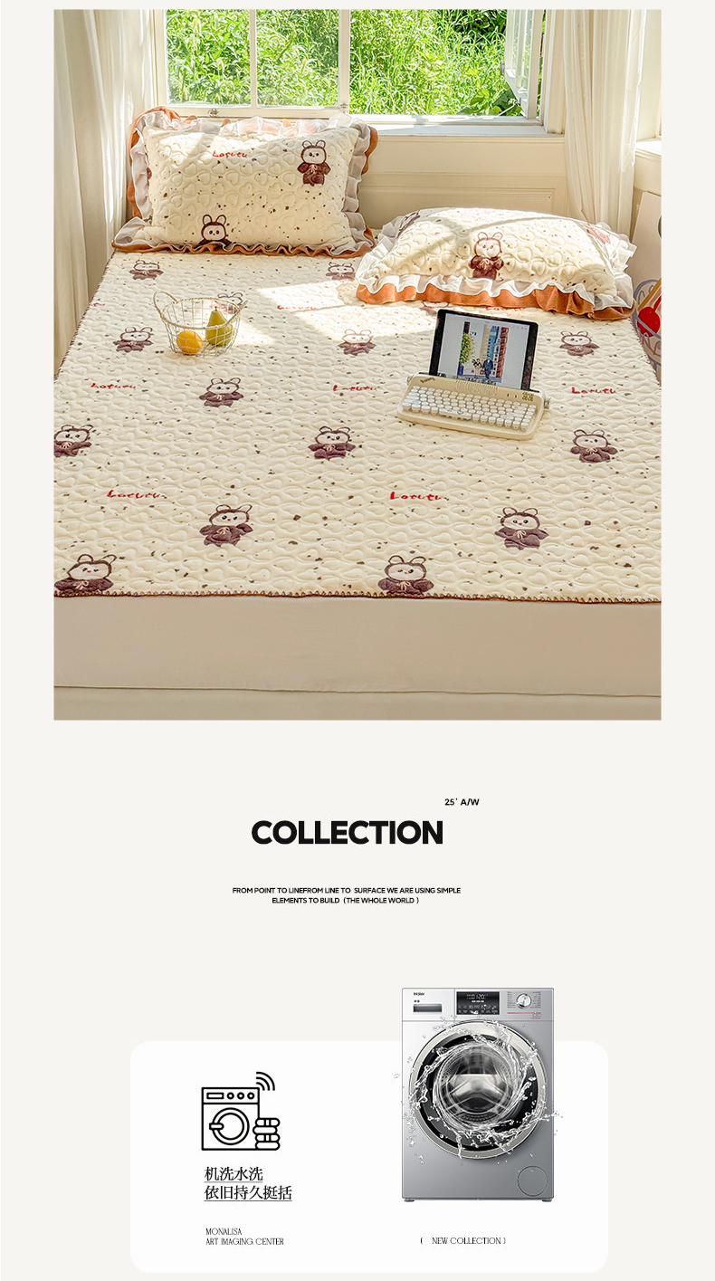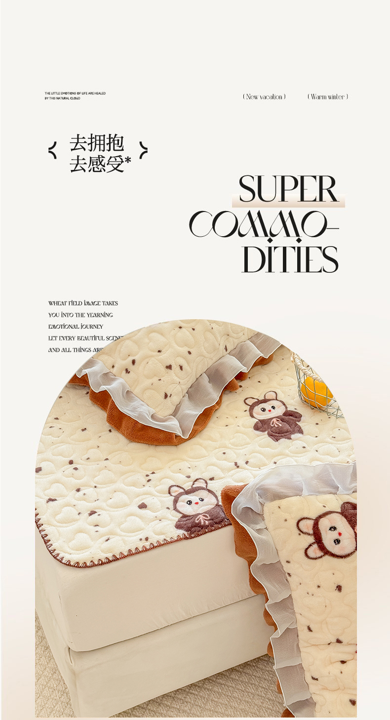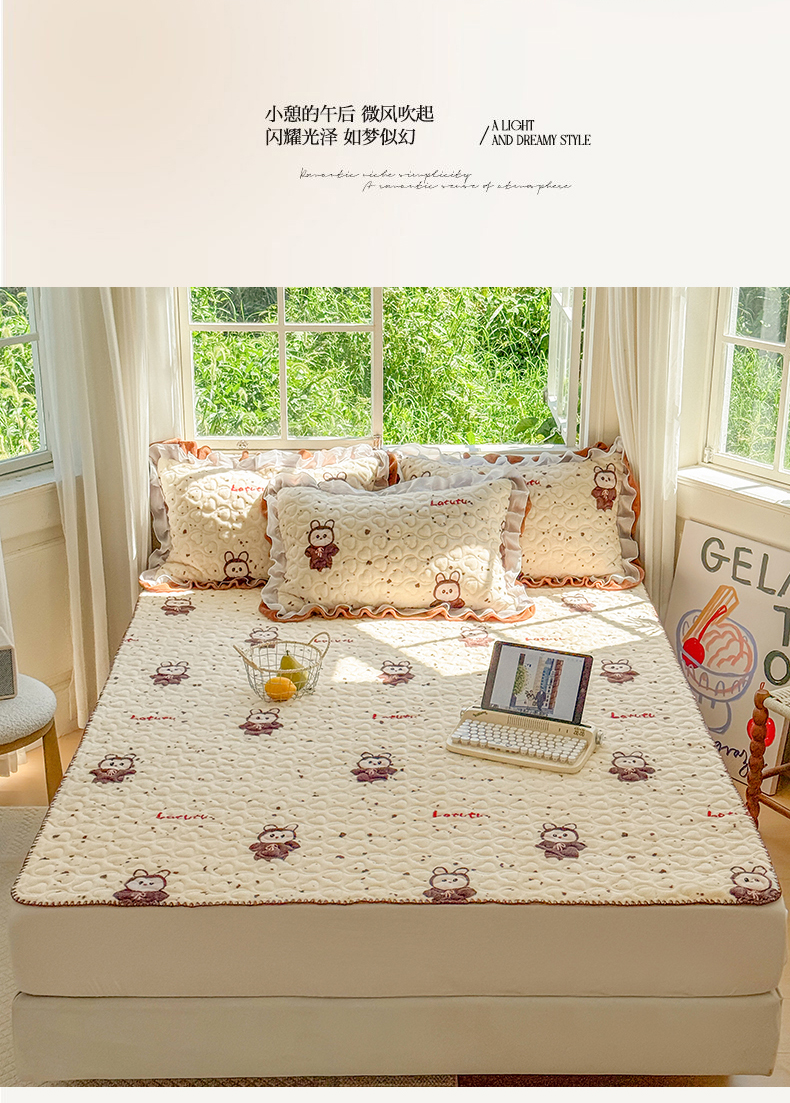 (总)禧缘家纺(原梦想家) 2025新款夹棉双层花边牛奶绒床笠三件套系列,布布乐园,步步生花,杏花微雨,雾都茶花,摩卡小镇,猫咪心事,浪漫花开,蓝铃风语,狗狗岛屿,落日云舒