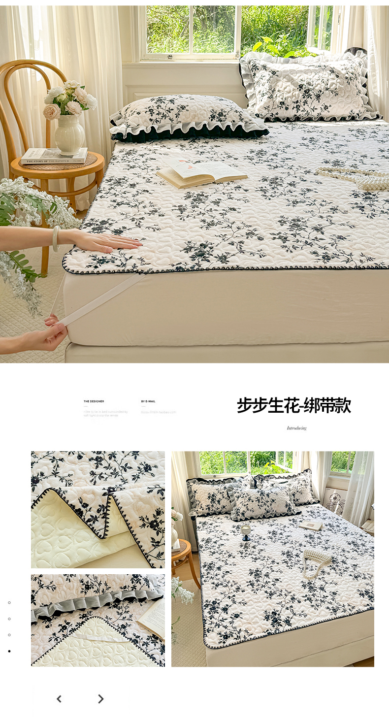 禧缘家纺(原梦想家) 2025新款牛奶绒三角针绑带款夹棉床笠床单 步步生花-绑带款