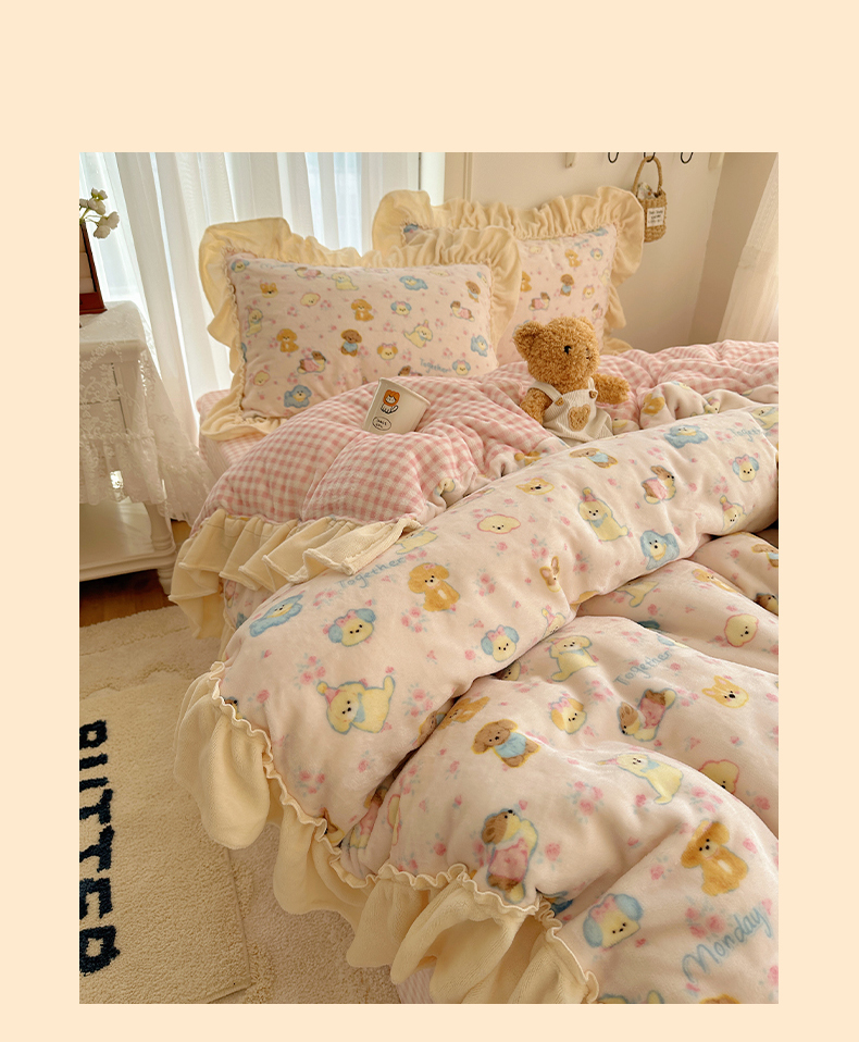 (总)瑞莱 2025冬季创意花边A类牛奶绒四件套套件,蓝枝小狗,雪中梅,奶油樱桃,粉爱心,粉黑蝴蝶结,粉蝴蝶结,黄粉爱心,蓝黑蝴蝶结,蓝蝴蝶结