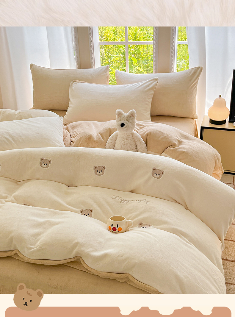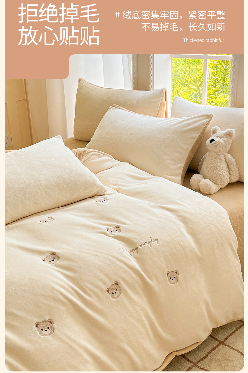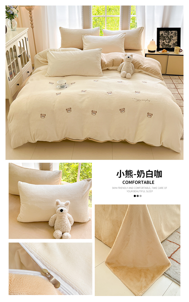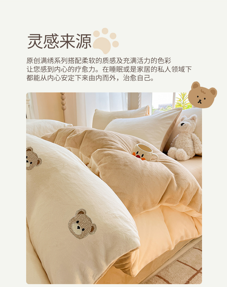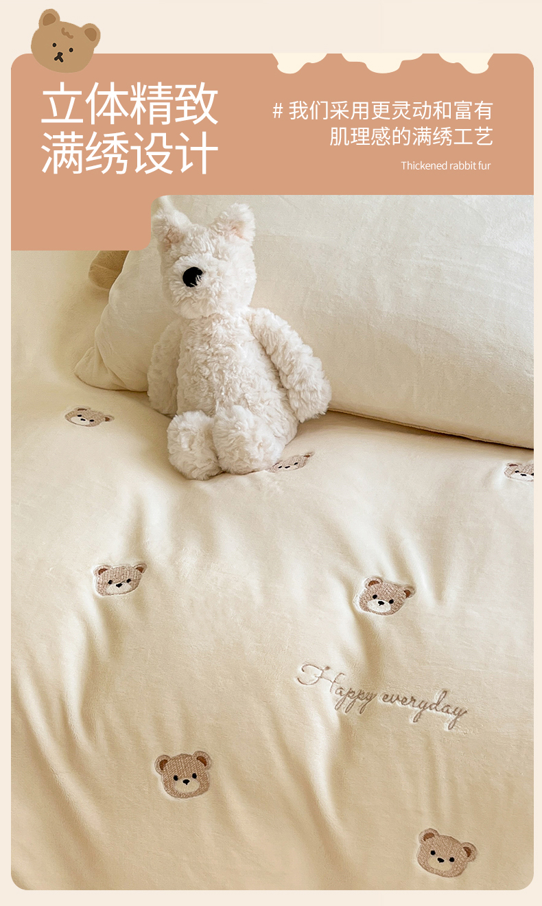 云棉坊 2025新款高克重牛奶绒四件套-满绣系列 小熊-奶白咖