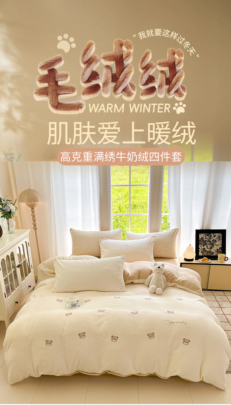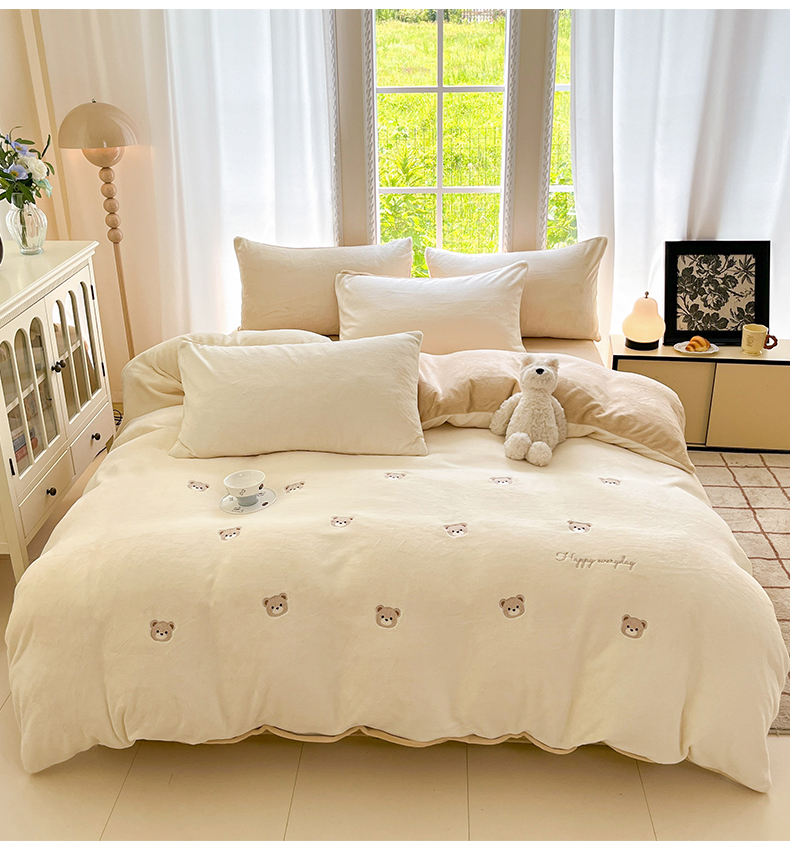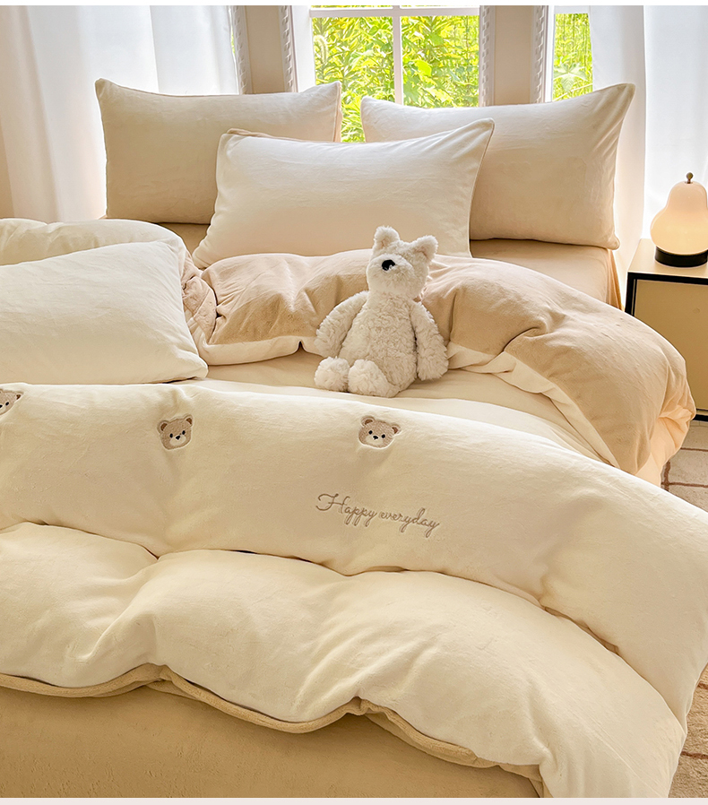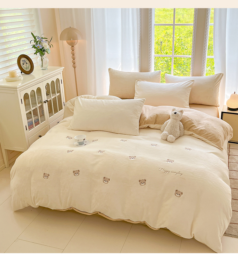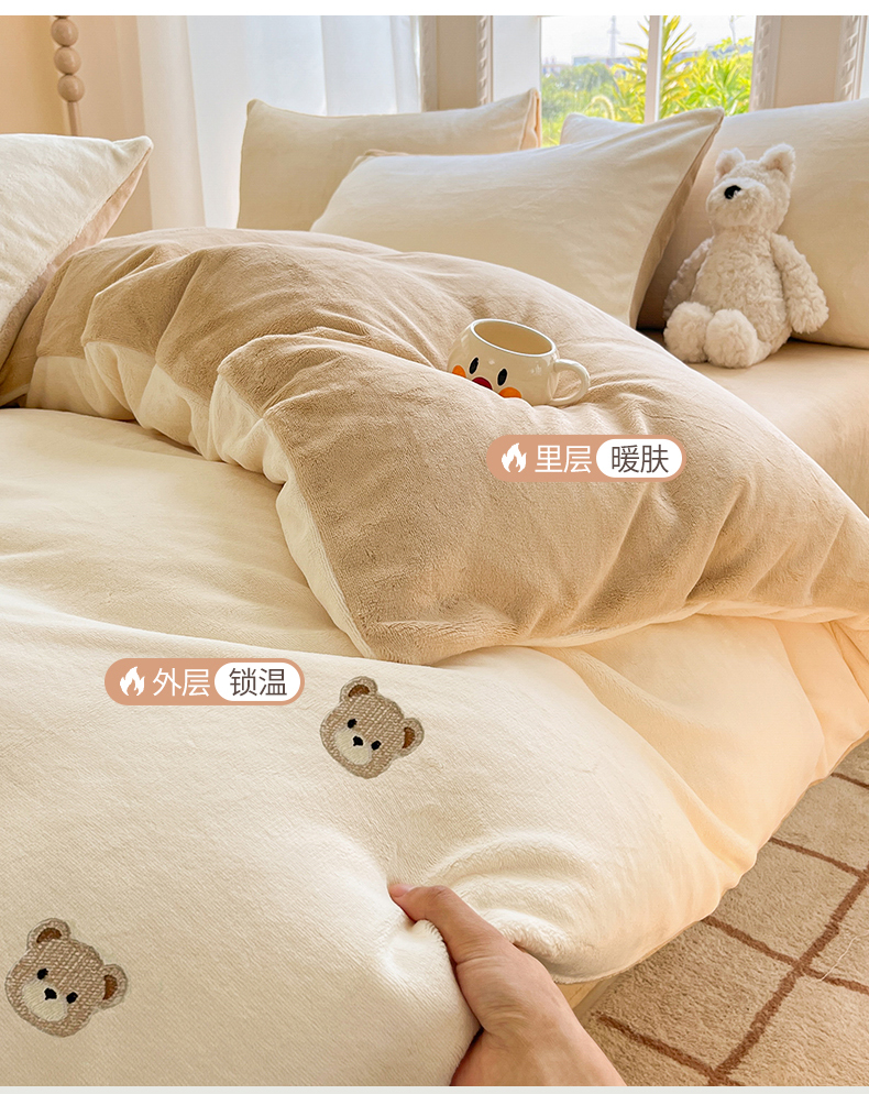 云棉坊 2025新款高克重牛奶绒四件套-满绣系列 小熊-奶白咖