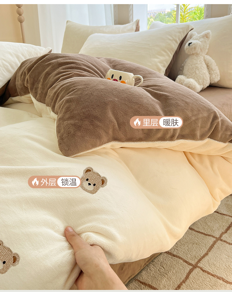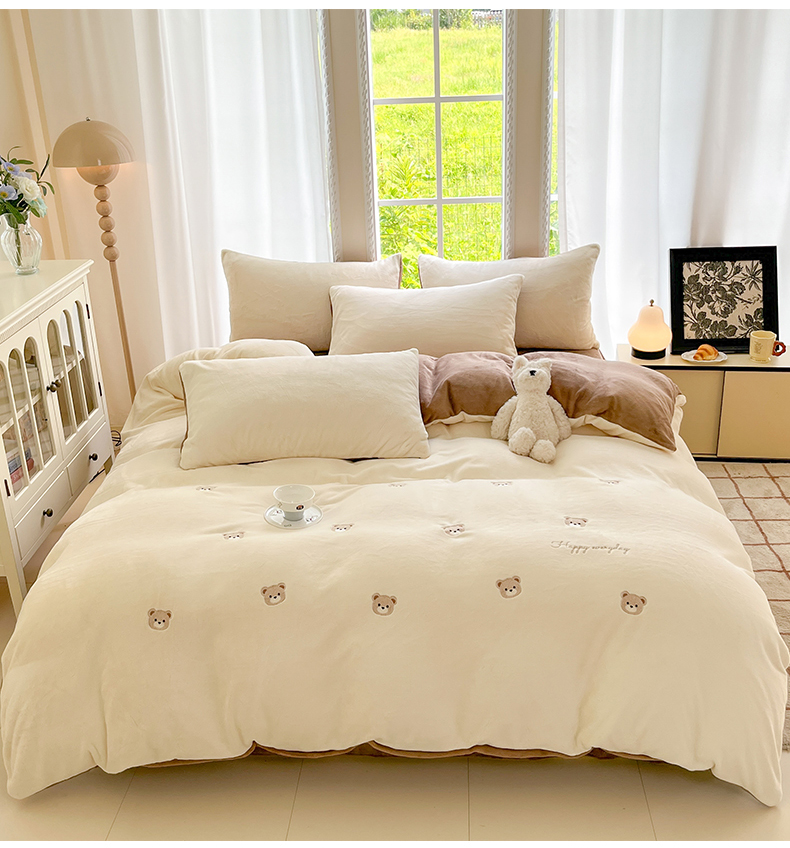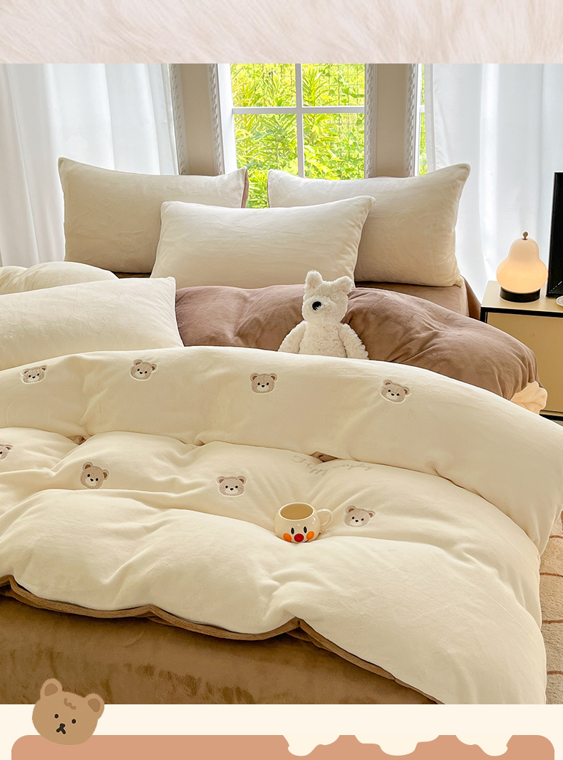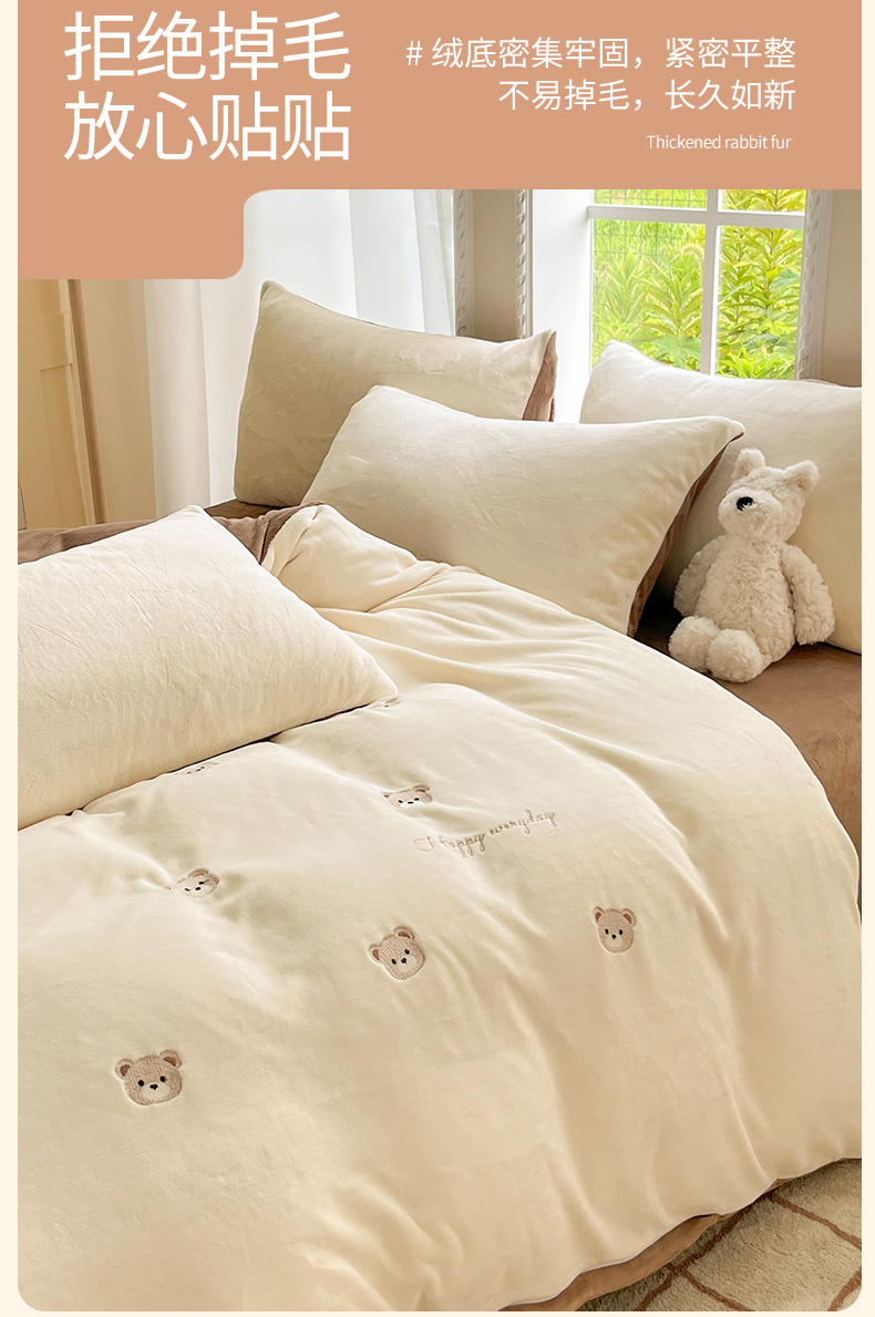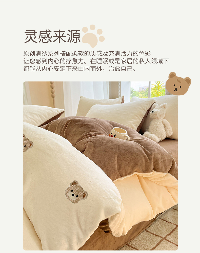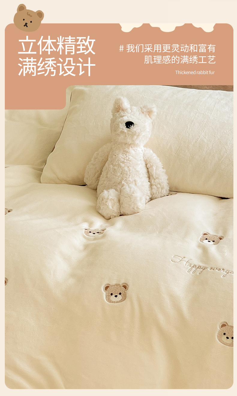 云棉坊 2025新款高克重牛奶绒四件套-满绣系列 小熊-奶白棕